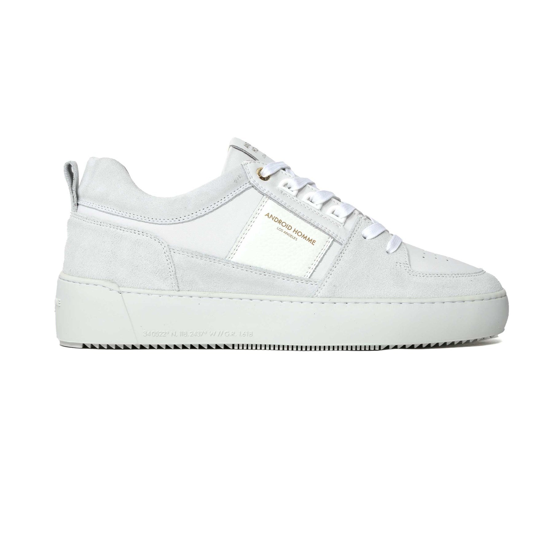 Android Homme Point Dume Low Trainer in White. Luxury trainers by Android Homme. This Android Homme trainer arrives with leather and suede upper panels. Tonal colour sole. Punch hole design to the upper. Textured panel design to the side. Finished off with 6 hole eyelets and D-rings. Pull tab to the heel. Android Homme logo tab to the tongue and printed logo to the side panel.