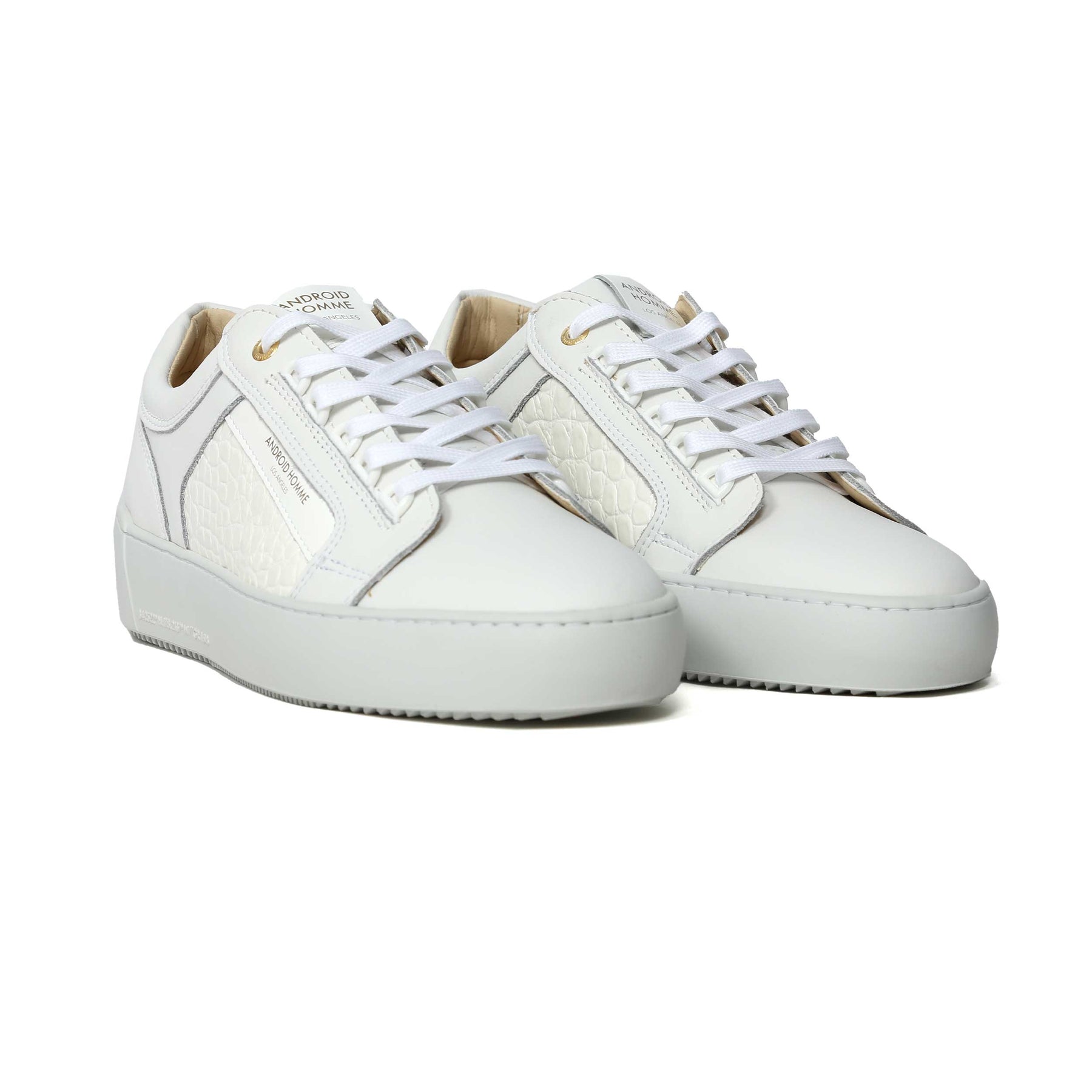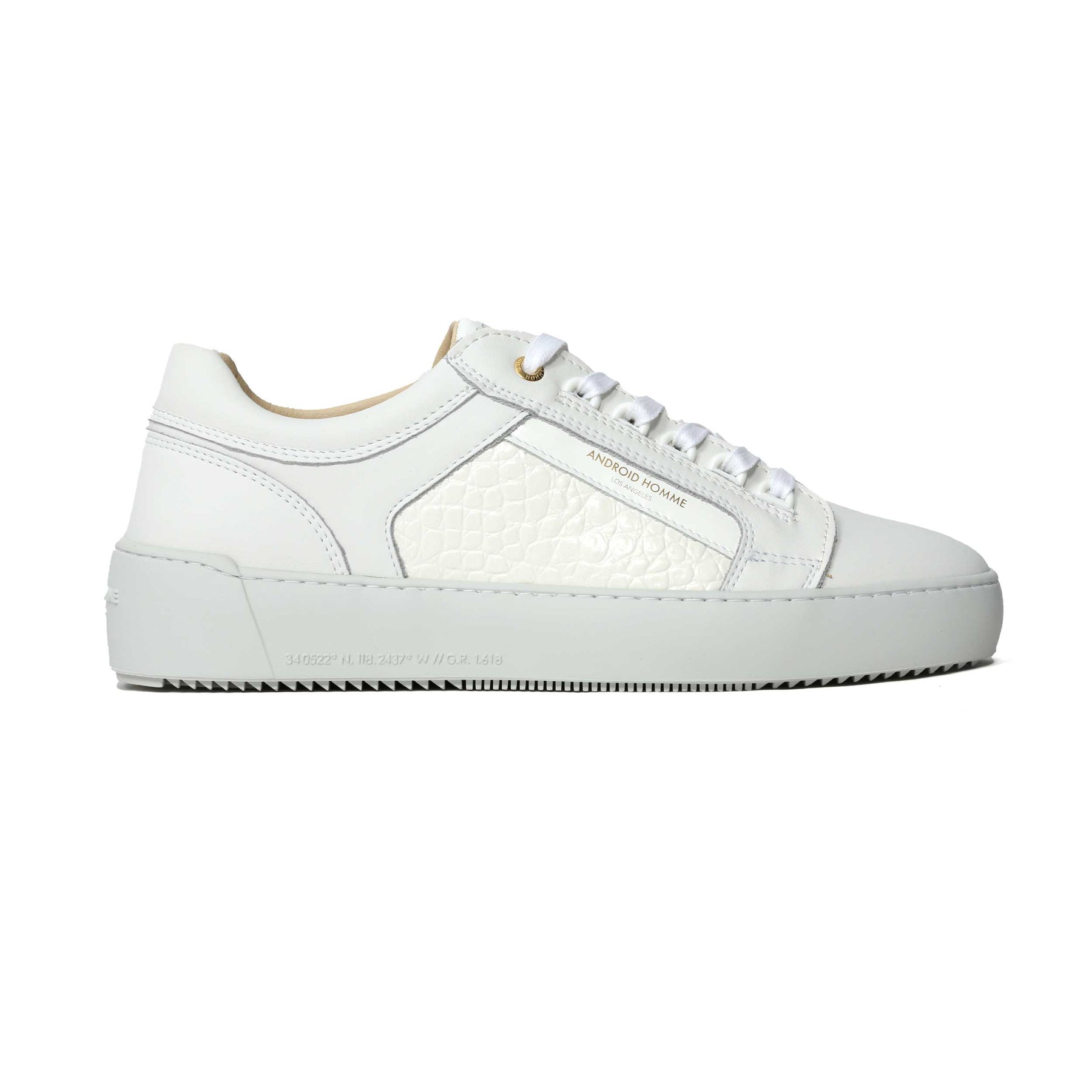 Android Homme Venice Patent Croc Trainer in White. Luxury trainers by Android Homme. This Android Homme trainer arrives with leather and patent upper panels. Tonal colour sole. Textured faux croc skin panel design. Finished off with 7 hole eyelets and D-rings. Android Homme logo tab to the tongue and printed logo to the side panel.