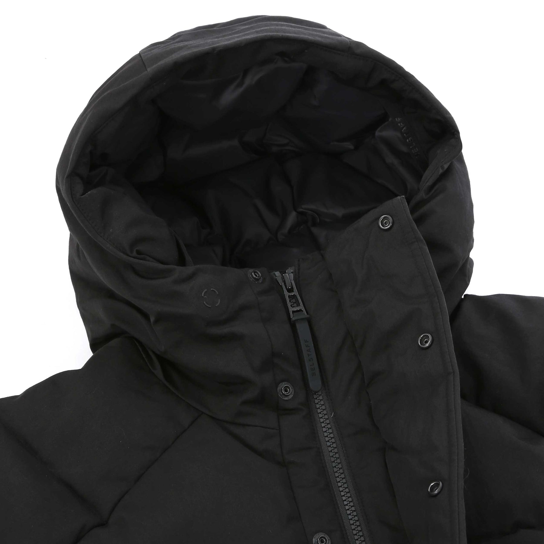 Belstaff Apex Jacket in Black. The Belstaff Apex Jacket in Black is crafted from a soft cotton-nylon blend. The water-repellent coating protects against the elements. Filled with premium 750-fill down, this mid-weight jacket delivers the perfect balance of warmth and comfort for everyday wear. Functional details include internal storm cuffs, a quick-adjust drawcord system, and a covered front zip with press studs for added protection. A signature Belstaff Phoenix patch on the sleeve. Zip fastened hip and internal pockets. Finished with adjustable hood and hem drawcords.
