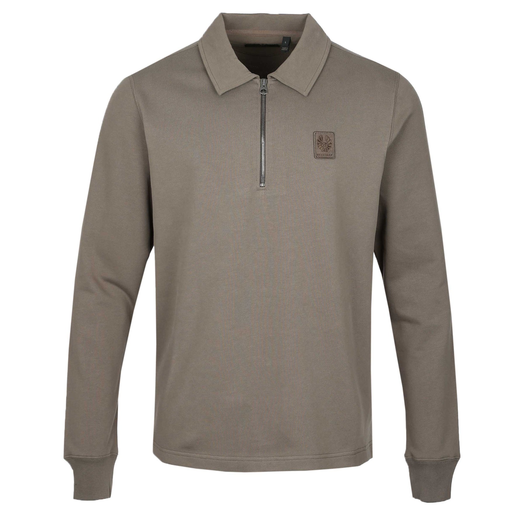 Belstaff Curator Collared Sweat Top in Major Brown. A quarter zip sweat top featuring a classic polo style collar. Ribbed cuffs and waistband. Finished with an embroidered Belstaff logo badge on the chest. Team up with sweat pants or jeans.