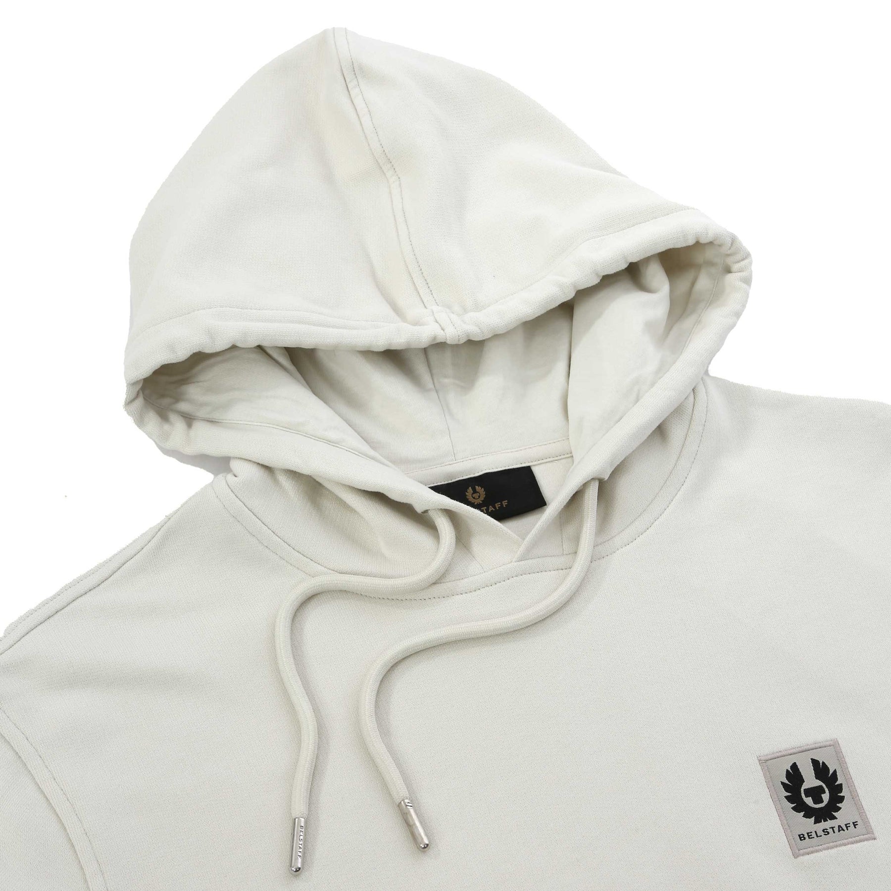 Belstaff Hoodie Sweat Top in Silver Birch. A classic hoodie by Belstaff. With an adjustable hood with drawstrings and kangaroo pocket to the front. Finished with the Belstaff logo on the chest, perfect for everyday wear.