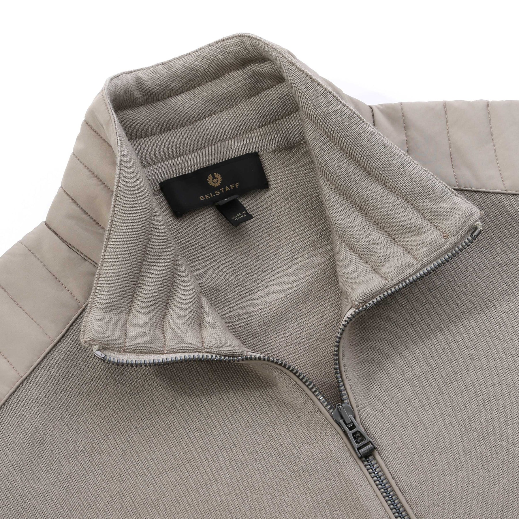 Belstaff Kelby Zip Cardigan in Dark Sand. A zip up cardigan by Belstaff. A versatile piece featuring cardigan style sleeves with a quilted panel design to the front. Featuring a full zip fastening and the Belstaff logo on the left sleeve. Made in Italy crafted from 100% Wool.