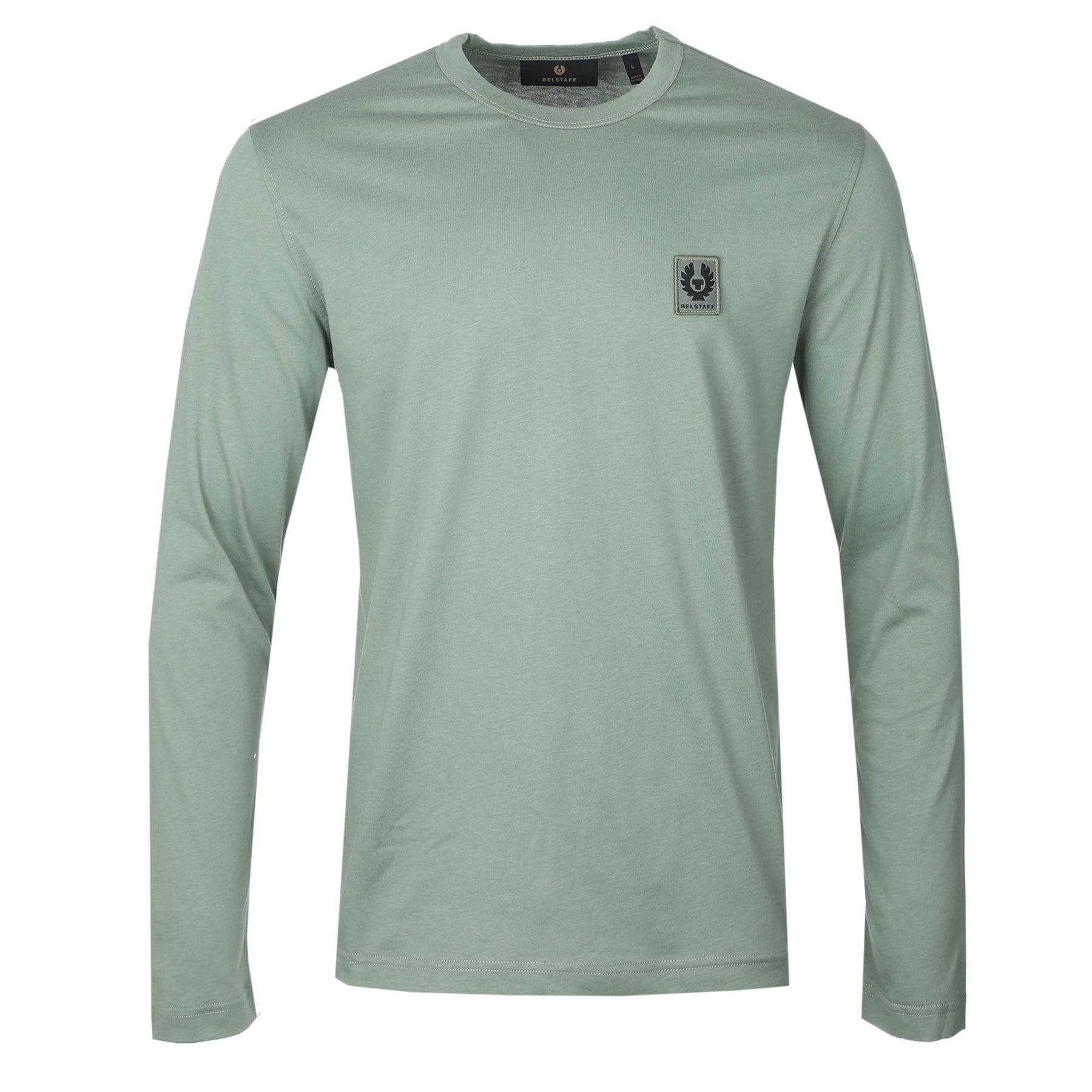 Belstaff Long Sleeve T Shirt in Sage Green. A classic crew neck, long sleeve t-shirt by Belstaff. A plain design t-shirt perfect for everyday wear. Featuring the iconic Belstaff logo on the chest.