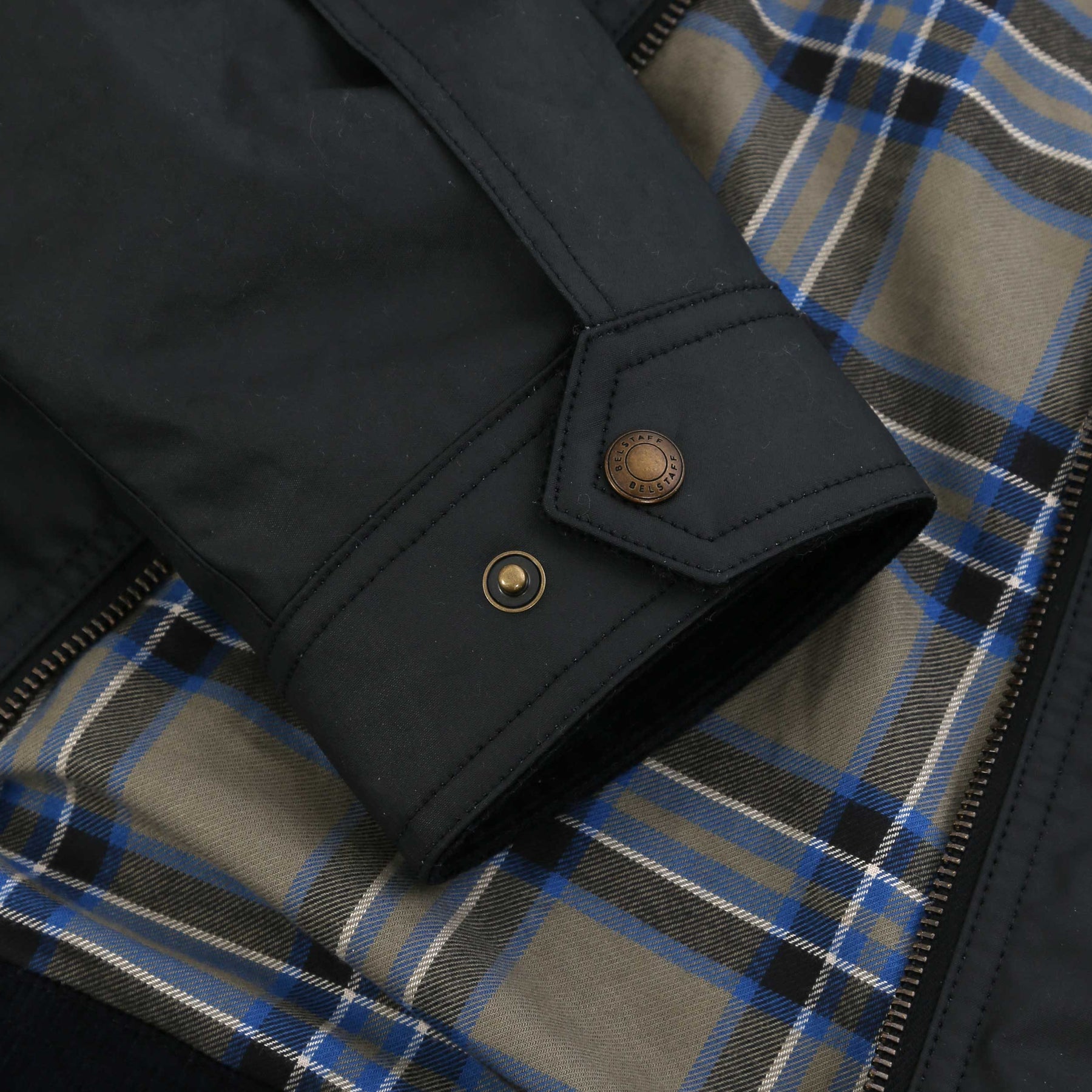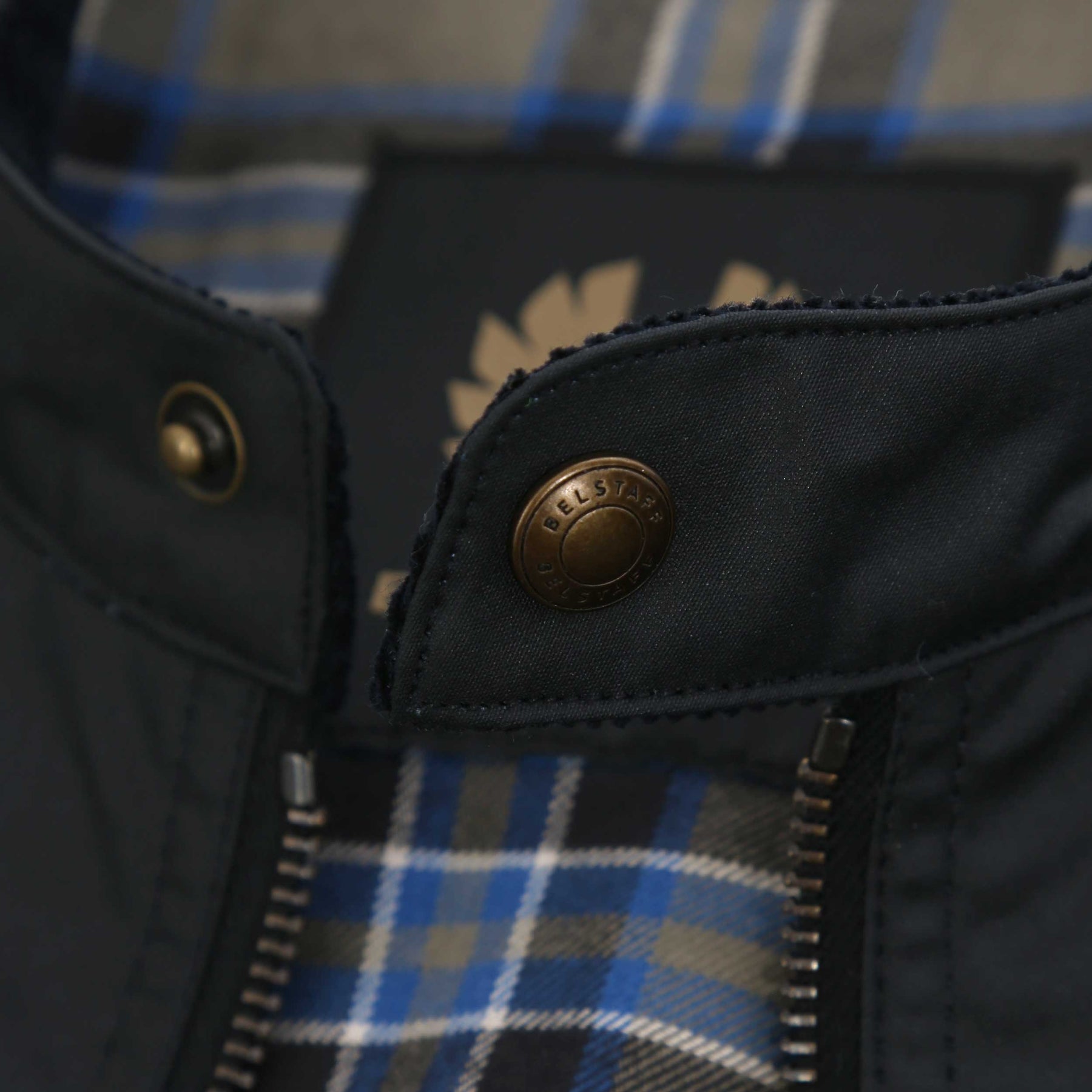 Belstaff Sideline Jacket in Navy delivers a clean, relaxed interpretation of the café racer silhouette, first introduced in 2025. Constructed from 6oz British Millerain waxed cotton, it provides reliable wind and water resistance with exceptional durability. Designed to age beautifully, the waxed finish develops unique character over time, enhancing its lived-in appeal. Inside, a cotton twill lining woven in Belstaff’s signature check adds a refined heritage touch, balancing practicality with understated style.