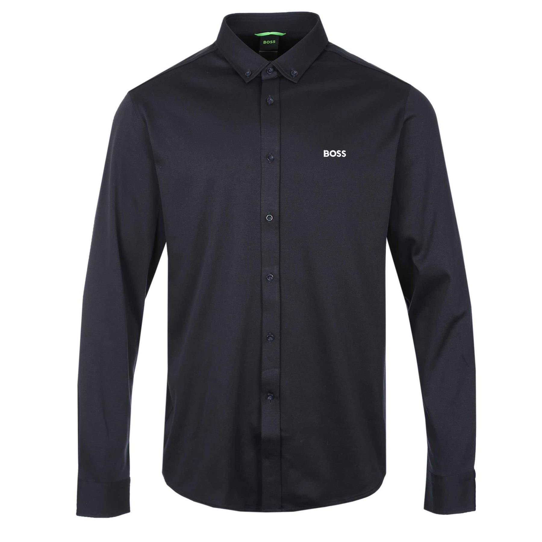 BOSS B Motion L Shirt in Dark Blue. A long sleeve Hugo Boss shirt in a regular fit. Featuring button down collar and a contrasting colour embroidered BOSS logo to the chest. Adjustable button fastening cuffs. The shirt is constructed with a 4 way stretch, moisture-wicking cotton, keep you feeling cool and fresh all day.