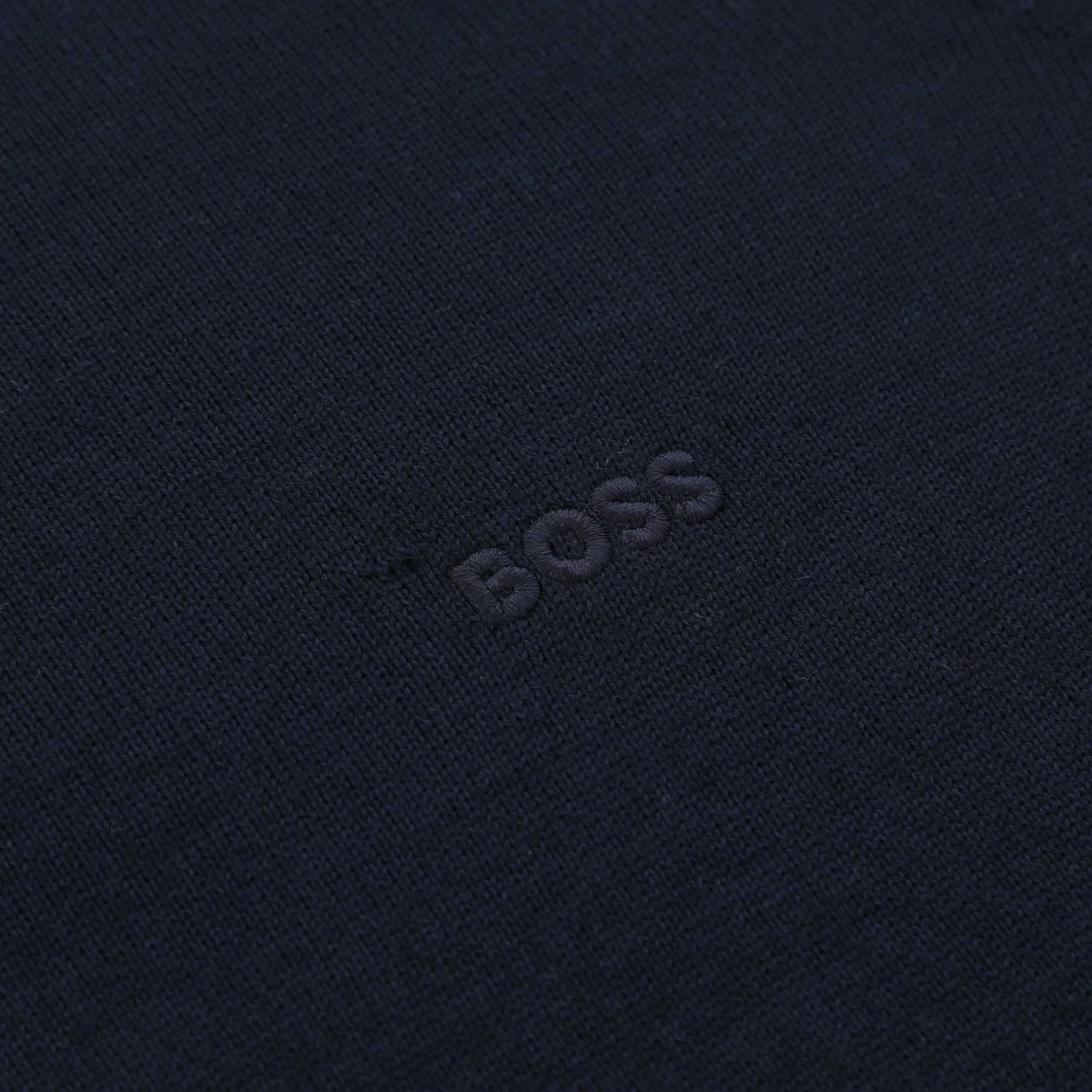BOSS Balonso L Knitwear in Dark Blue. A sleek full-zip layer from BOSS, finished in a clean black palette for maximum versatility. It features a high stand ribbed collar, ribbed cuffs, and a stretch ribbed waistband for a streamlined fit that keeps its shape. Subtle top-stitch detailing adds refinement, while the signature BOSS woven pinch tag at the left side seam delivers an understated branded touch. A modern everyday essential built for effortless style.
