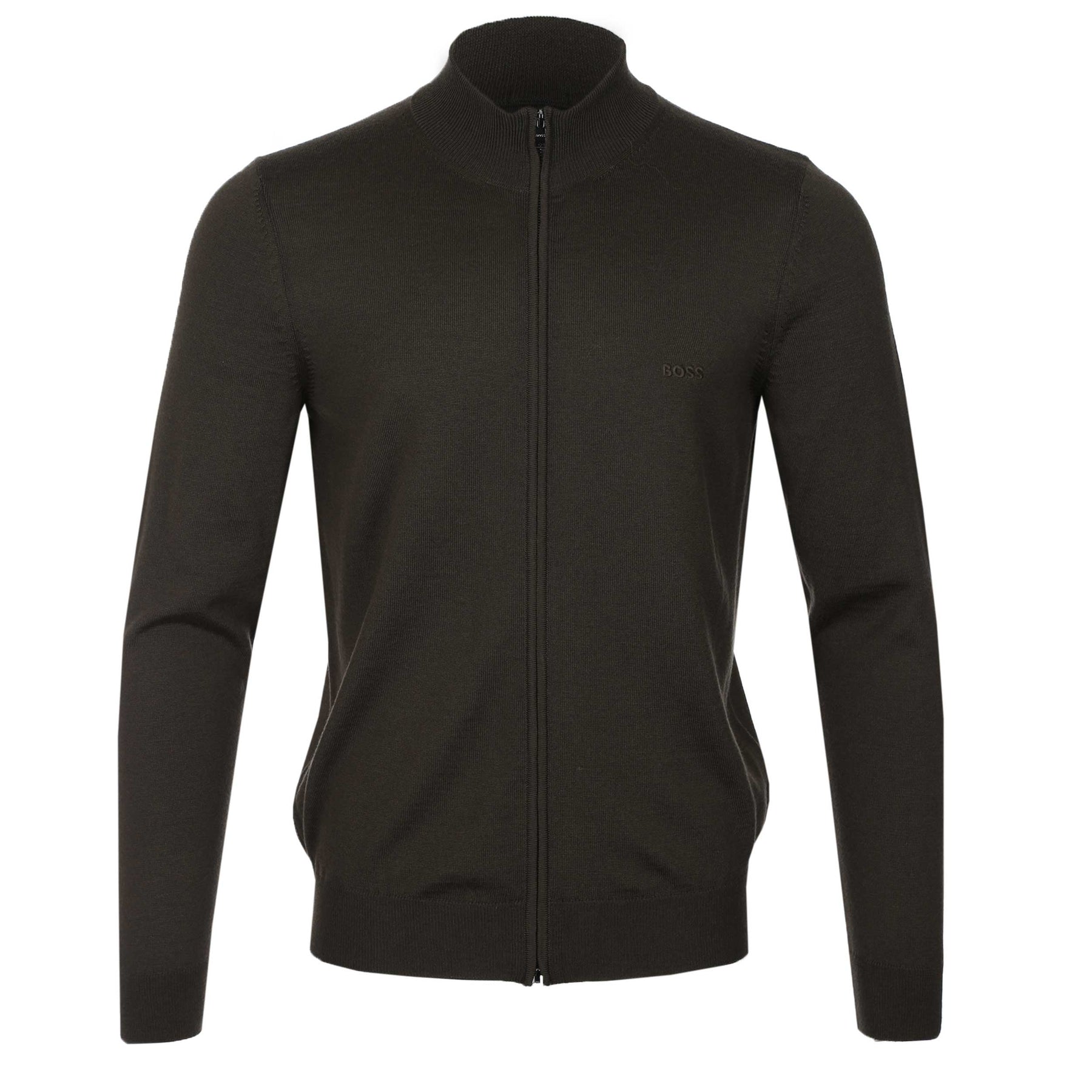 BOSS Balonso L Knitwear in Open Green. A sleek full-zip layer from BOSS, finished in a clean black palette for maximum versatility. It features a high stand ribbed collar, ribbed cuffs, and a stretch ribbed waistband for a streamlined fit that keeps its shape. Subtle top-stitch detailing adds refinement, while the signature BOSS woven pinch tag at the left side seam delivers an understated branded touch. A modern everyday essential built for effortless style.