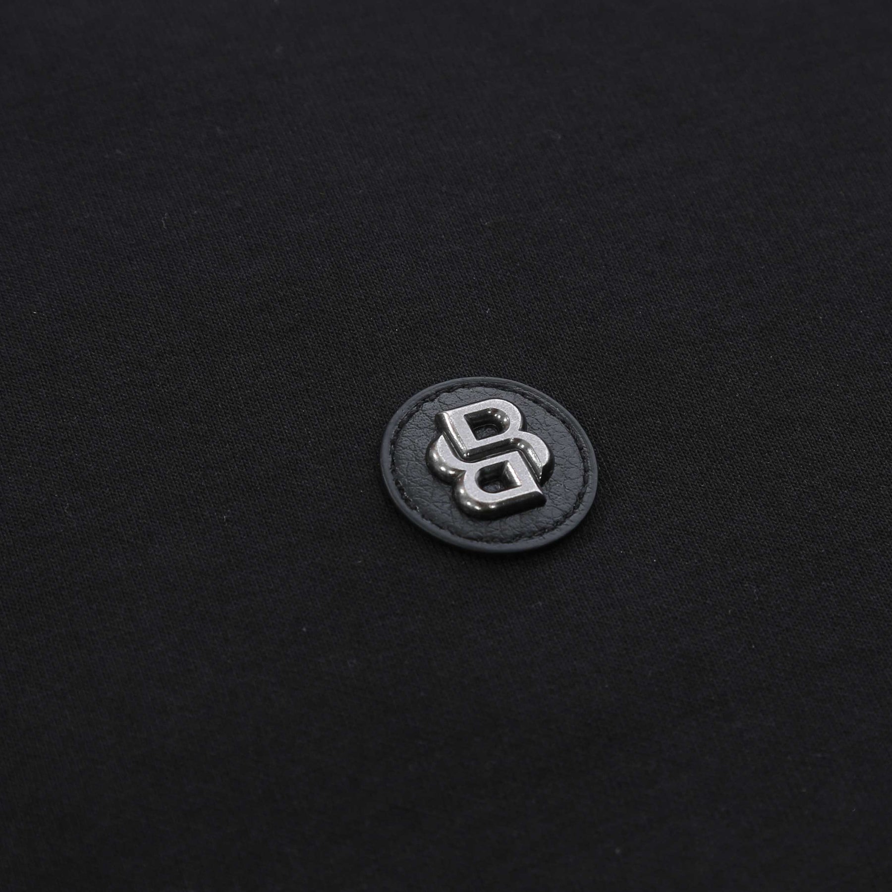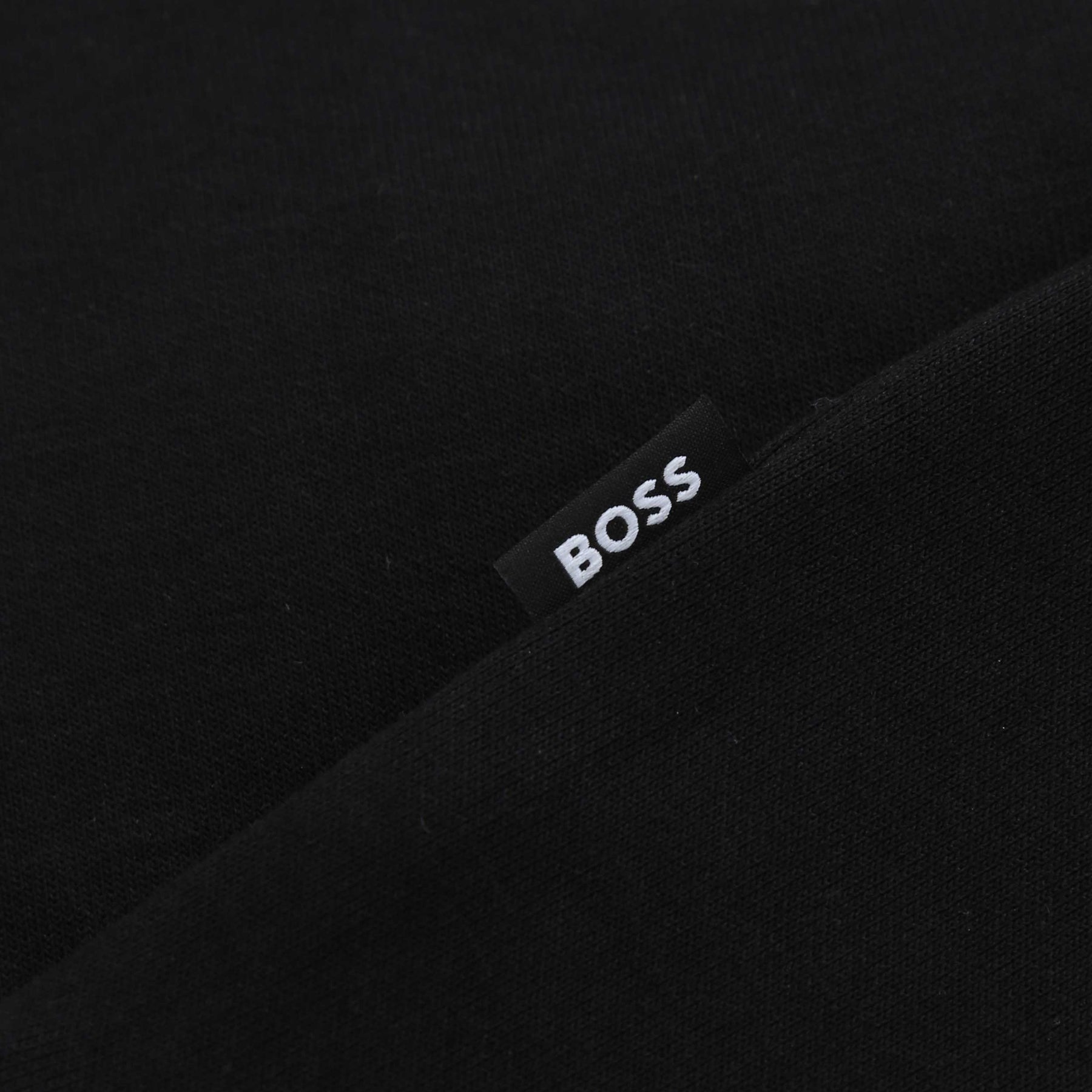BOSS C Sharpe 01 Sweatshirt in Black. A refined ribbed crew neck crafted with ribbed cuffs and a stretch ribbed hem for a clean, structured fit. Finished with a black-and-dark-silver BOSS metal-and-fabric logo patch on the chest and a signature woven logo pinch tag at the lower left seam, it’s a sharp everyday knit with unmistakable BOSS detailing.