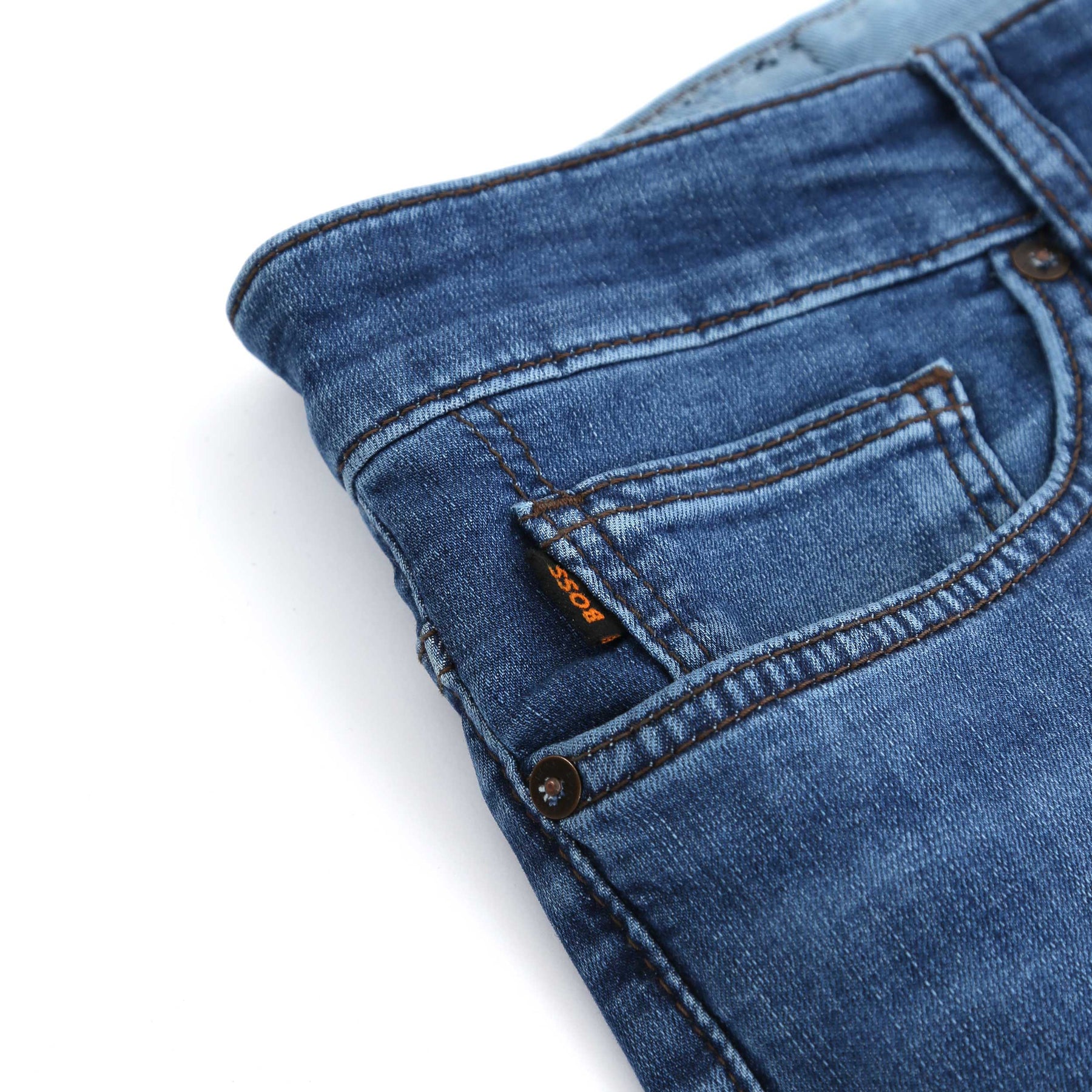 BOSS Delaware BO S.NOOZE Jean in Medium Blue. BOSS Delaware jeans arrive in a slim fit, made from a brushed cotton with stretch for added comfort. Featuring a regular zip fly fastening with button to waistband. Solid colour jean in a 5 pocket jean design. The perfect jean to wear casual, or smarten up by layering up with a shirt and jacket combination.