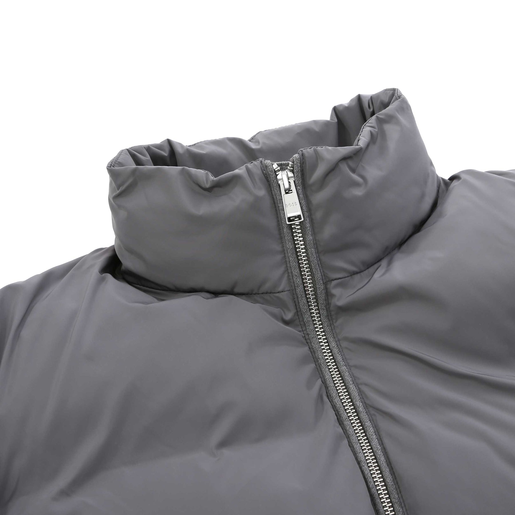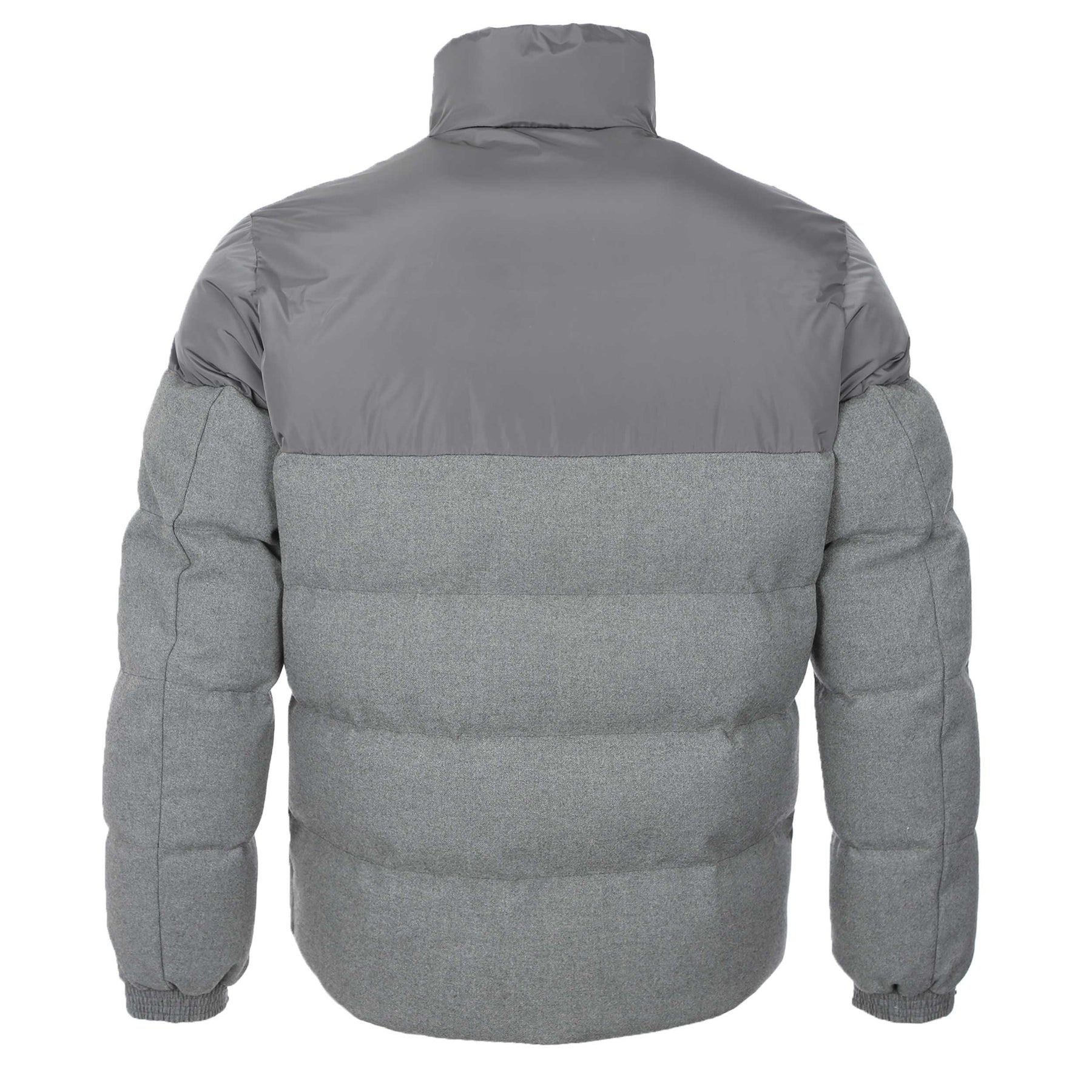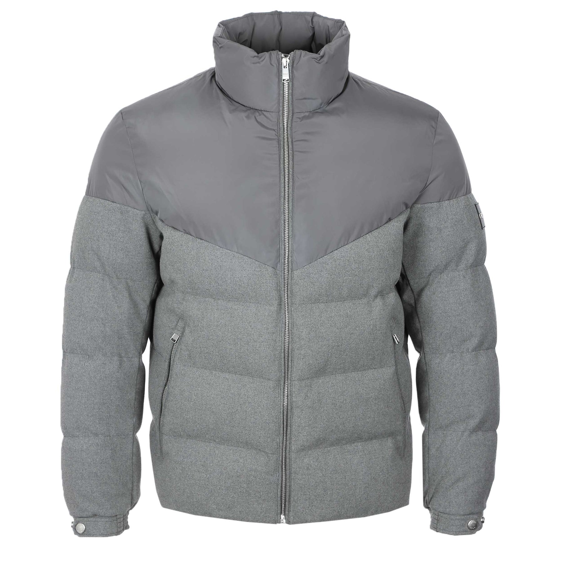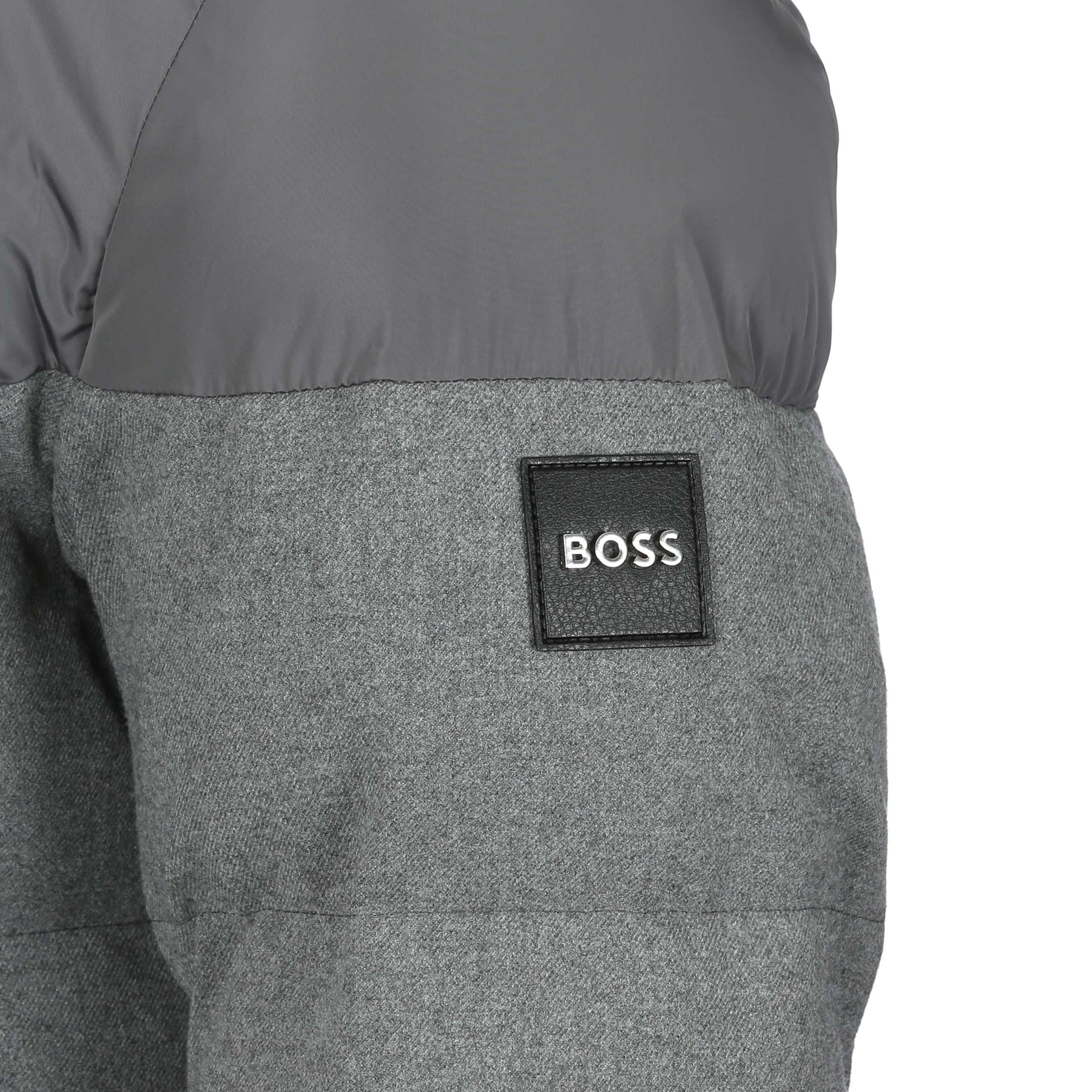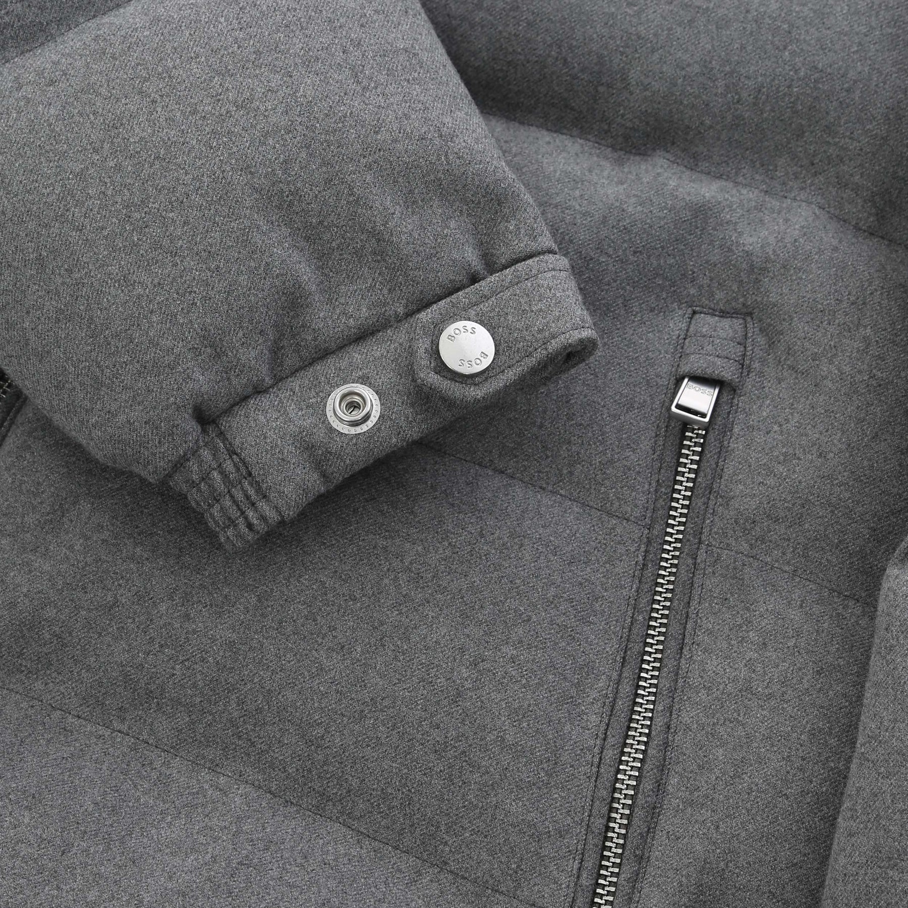 BOSS H Clanello 1 Jacket in Medium Grey. A classic jacket by BOSS. This quilted padded jacket has a regular fit and is water repellent. Full zip fastening front. Wool mix body with contrasting polyester sleeves. Ribbed shoulder and collar panel detailing. Two zip fastening pockets to the waist. Adjustable press stud fastening cuffs. Detailed with a BOSS logo badge on the left sleeve.