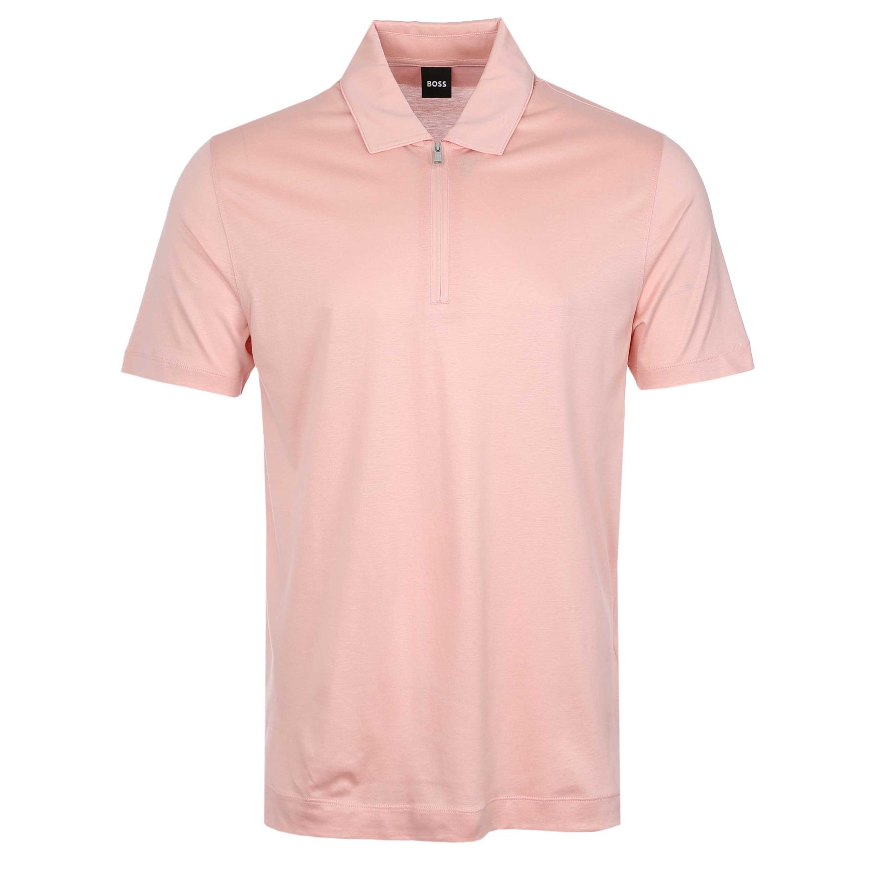 BOSS H Paras 50 Polo Shirt in Light Pastel Pink. A regular fit short sleeve BOSS polo shirt. Featuring a zip fastening placket. Plain design polo shirt finished with a BOSS logo tab to the side seam. Perfect for your everyday wardrobe.