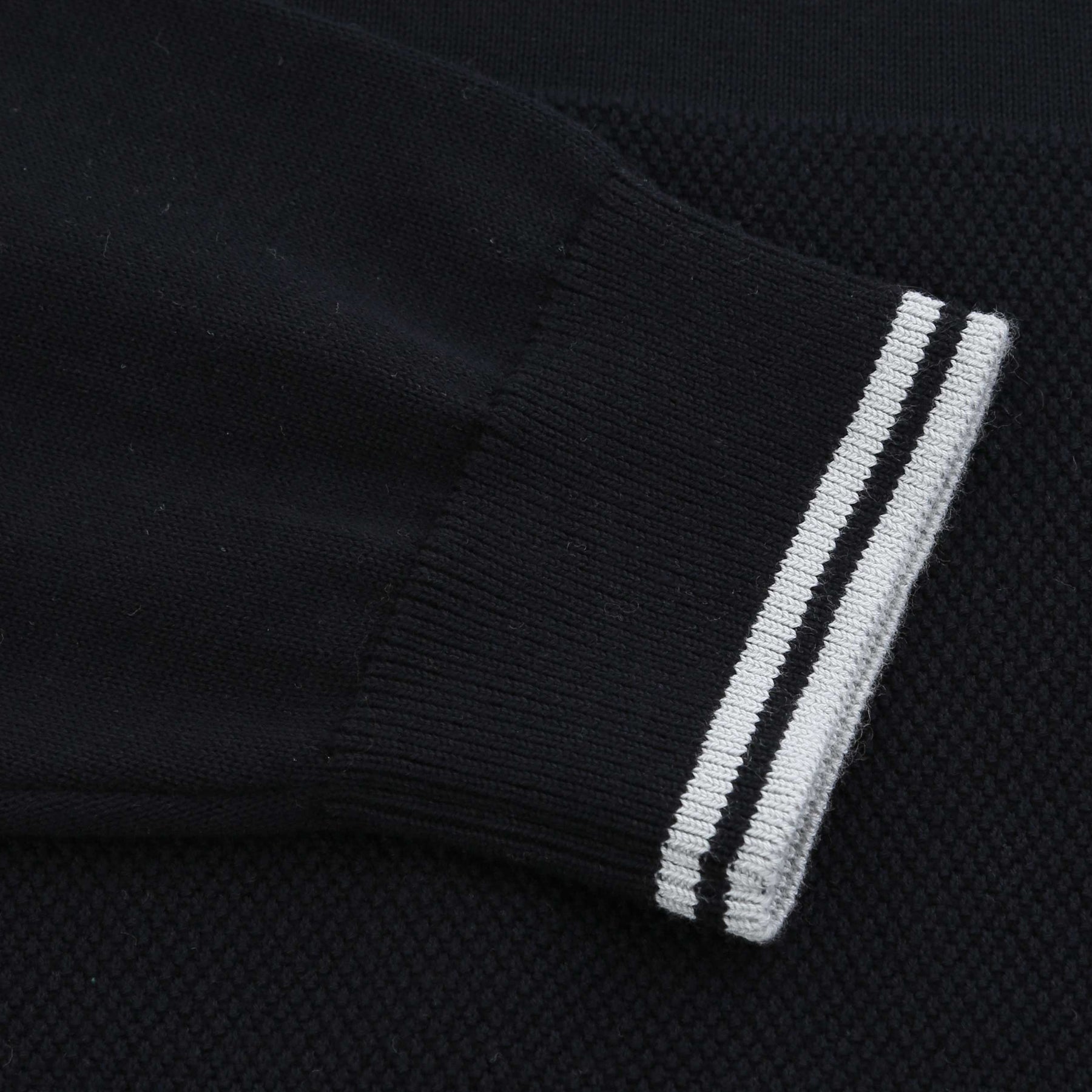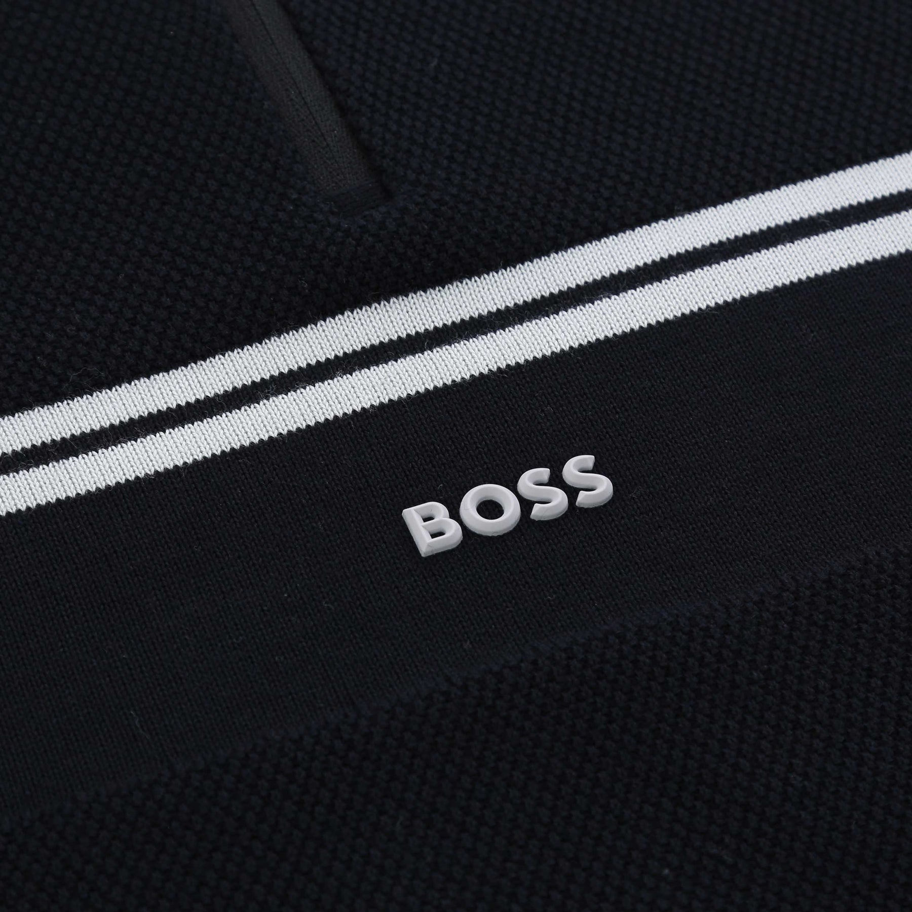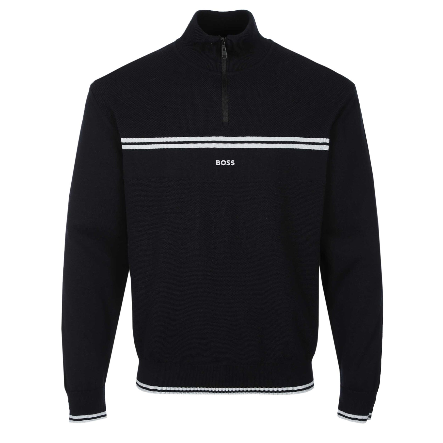 BOSS K Zone QZ Knitwear in Dark Blue. Stand collar with quarter fastening placket. Ribbed collar, cuffs and waistband. Rubber BOSS logo on the chest. Contrasting colour stripe design to the front panel, cuffs and waistband. A knitwear piece perfect to be worn everyday with jeans or on the golf course.
