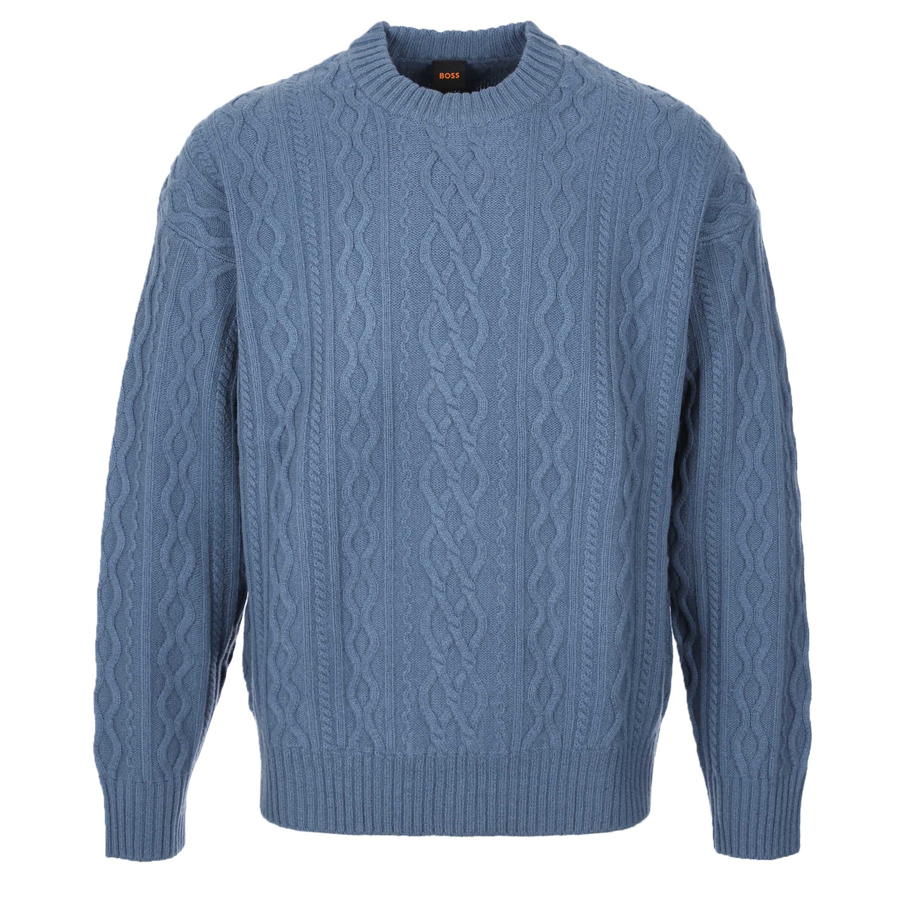 BOSS Kableto Knitwear in Open Blue. A classic piece of knitwear by BOSS. A modern take on a cold-weather classic, this BOSS cable-knit knitwear delivers effortless comfort with its relaxed fit and dropped shoulders. Crafted from ultra-soft, responsibly sourced wool, it offers warmth without weight and a premium feel you’ll reach for all season.
