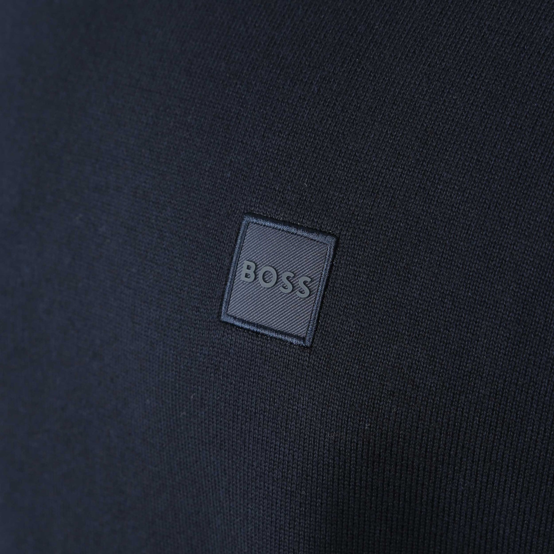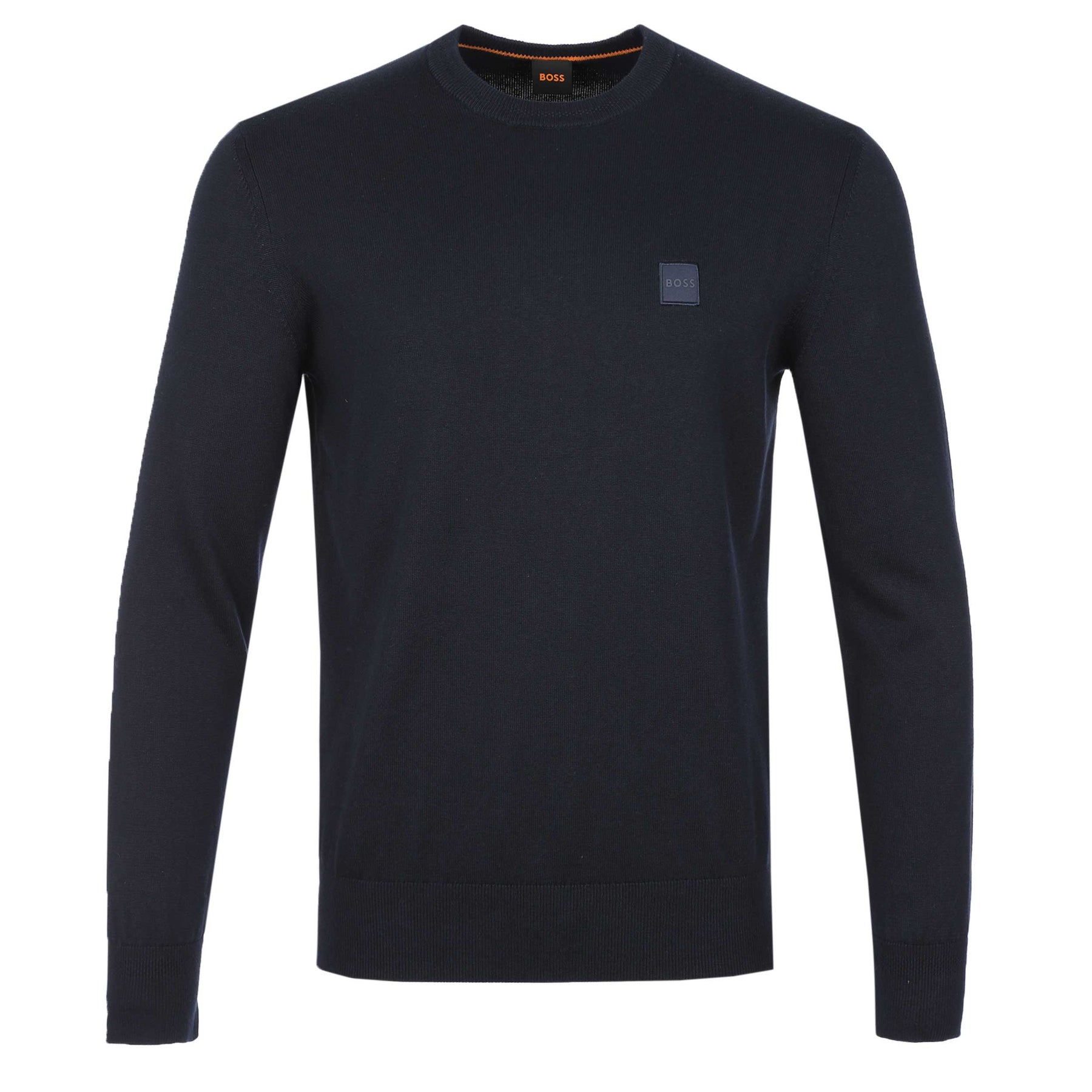 BOSS Kanovano S Knitwear in Navy. A classic piece of knitwear by BOSS. This jumper is a regular fit with crew neck and long sleeves. It has ribbed cuffs, cuts to a regular length and is detailed with a tonal BOSS square logo on the chest.