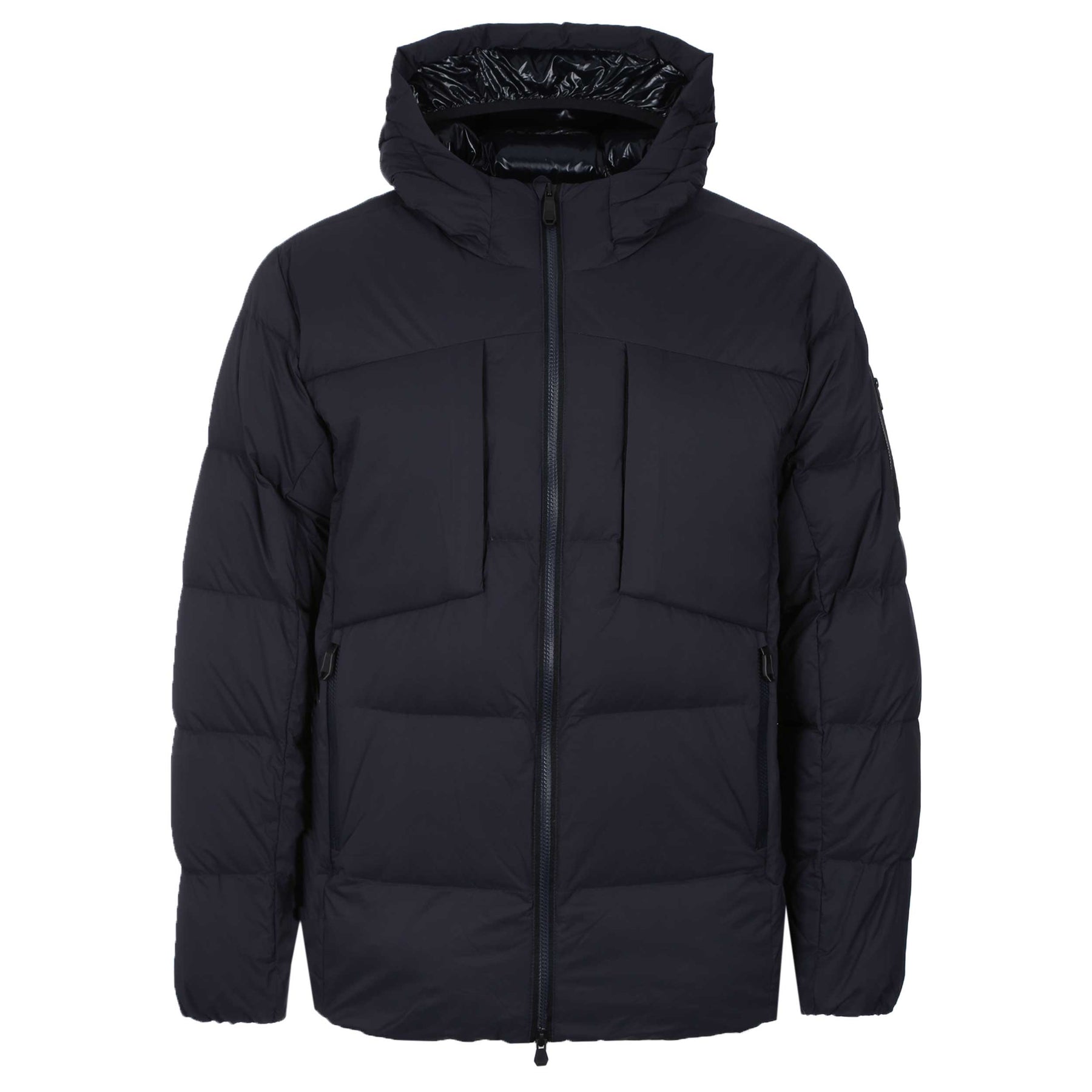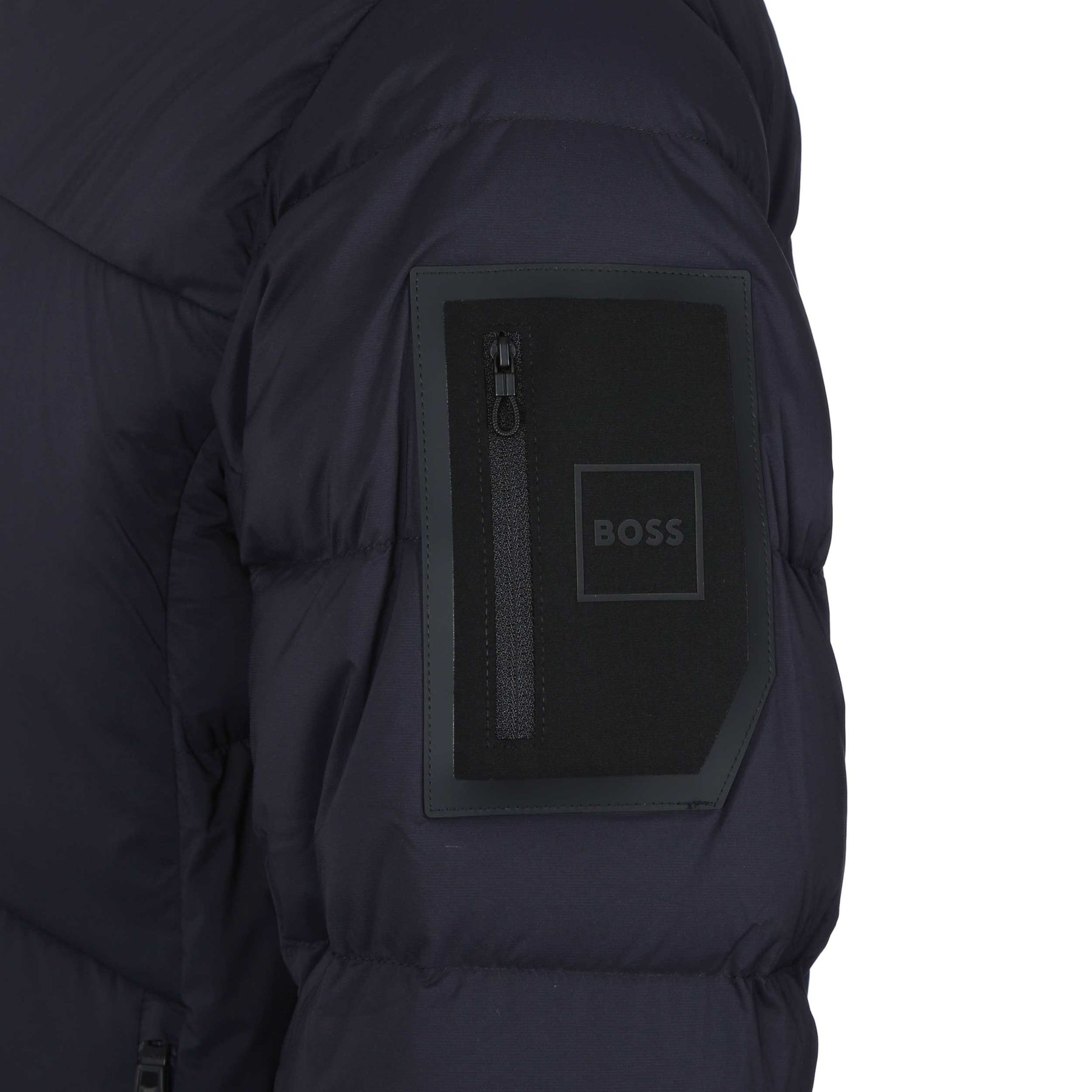 BOSS OW Riplite Puffer HD Jacket in Dark Blue. BOSS OW_Riplite Puffer Jacket in Dark Blue delivers premium cold-weather performance with a sharp, modern silhouette. Built from lightweight technical fabric with a high-insulation feel, it features a lined foldover hood and a full two-way zip for flexible ventilation and styling. Practical detailing includes double zippered hand pockets, a secure Napoleon chest pocket and a signature BOSS branded sleeve patch with an integrated zip pocket. The result is a men’s designer puffer jacket that balances functionality, warmth and refined everyday style.