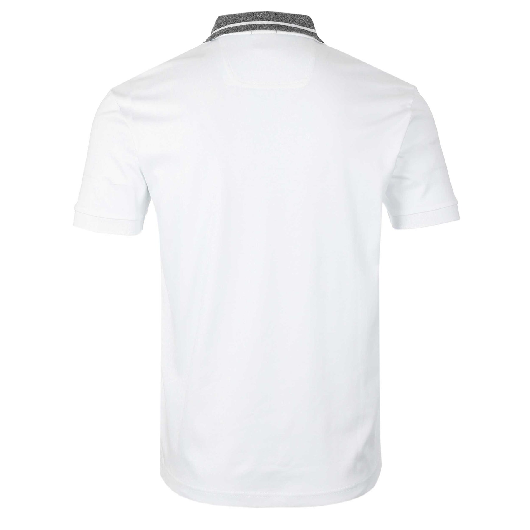 BOSS Paddy 1 Polo Shirt in White. A classic Hugo Boss polo shirt in a regular fit. A 2 button fastening placket with a contrasting colour rubber BOSS logo to the chest. Contrasting trims to the cuffs and placket.