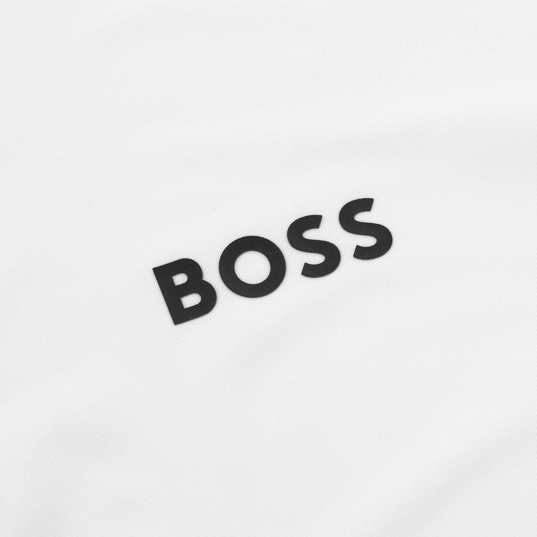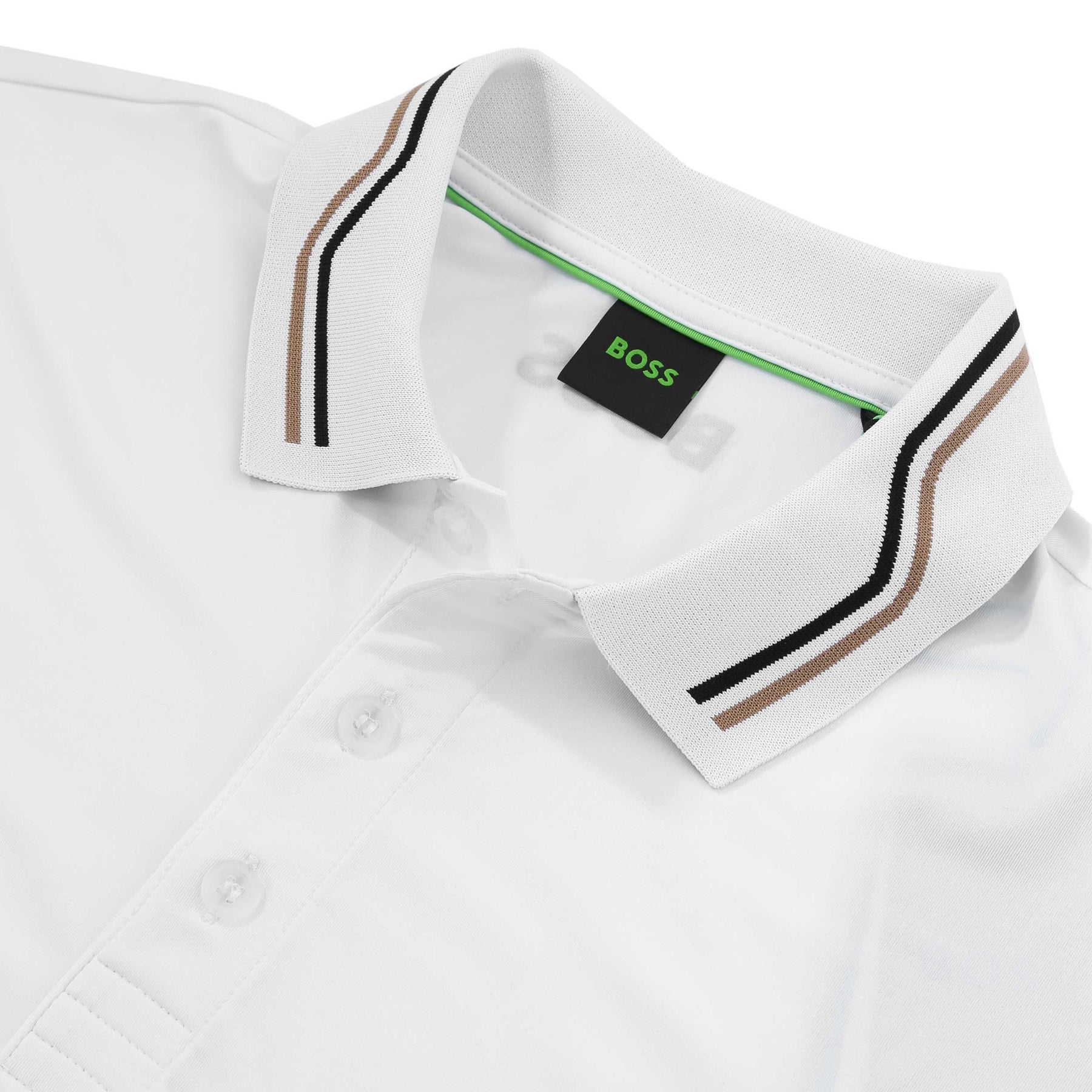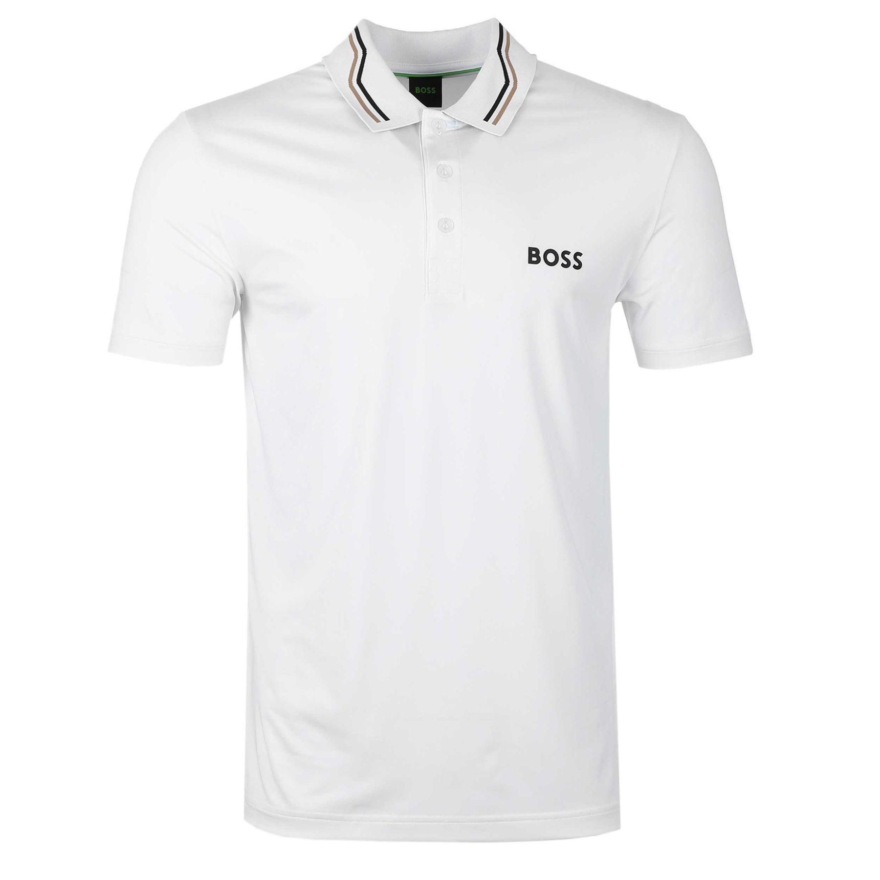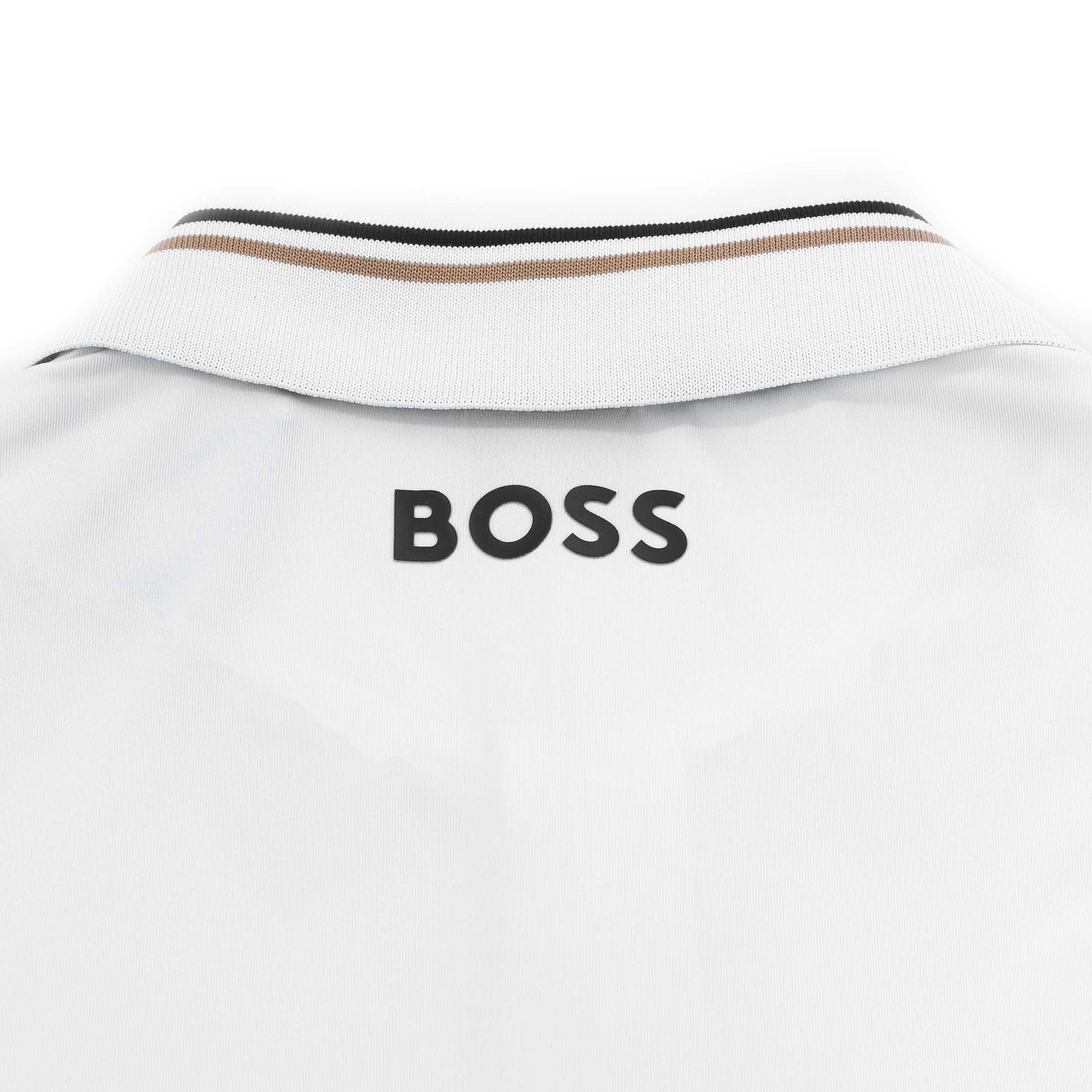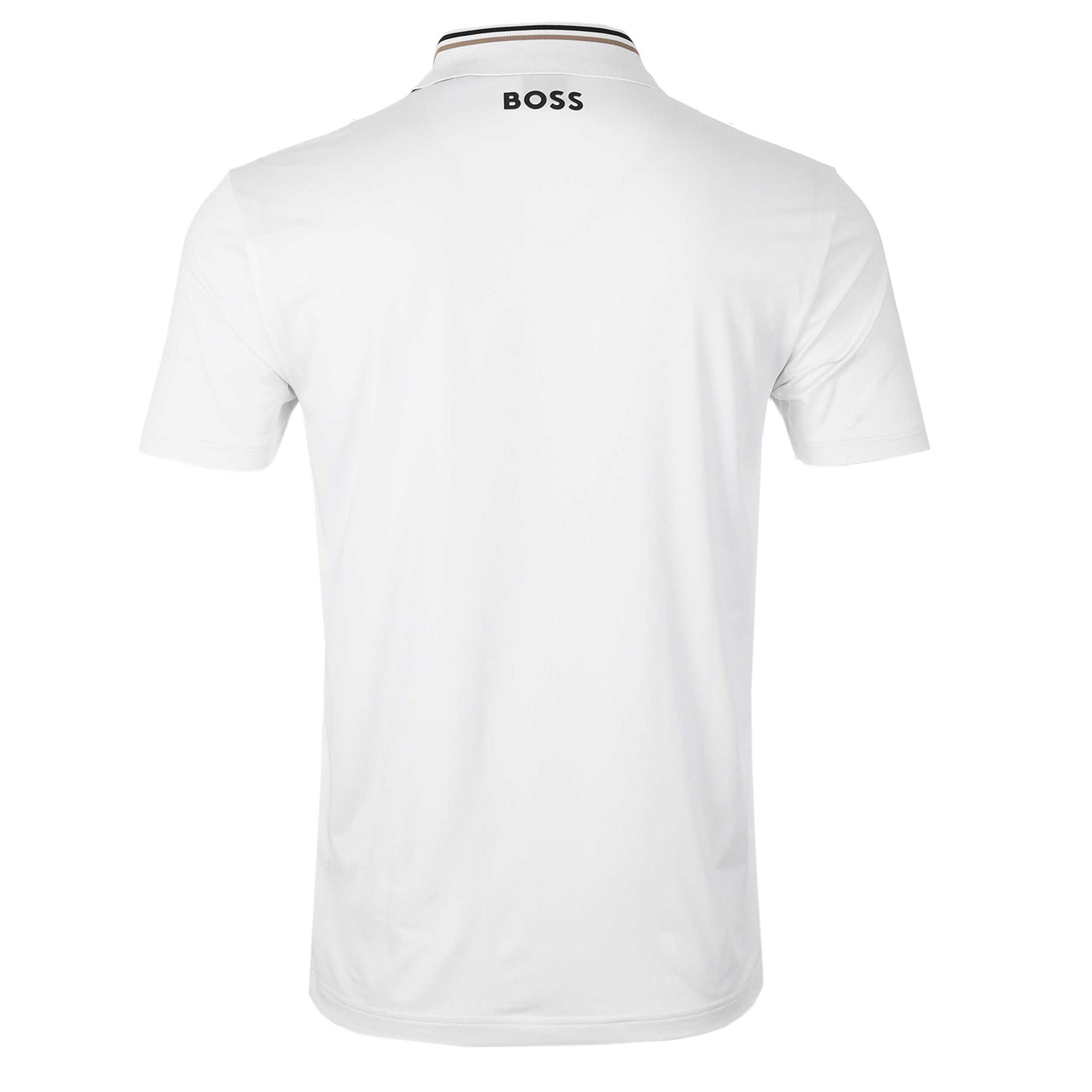 BOSS Paddytech Polo Shirt in White. A classic Hugo Boss polo shirt in a regular fit. A 2 button fastening placket with a contrasting colour rubber BOSS logo to the chest. Contrasting trims to the cuffs and placket. All over polka dot design make this polo shirt