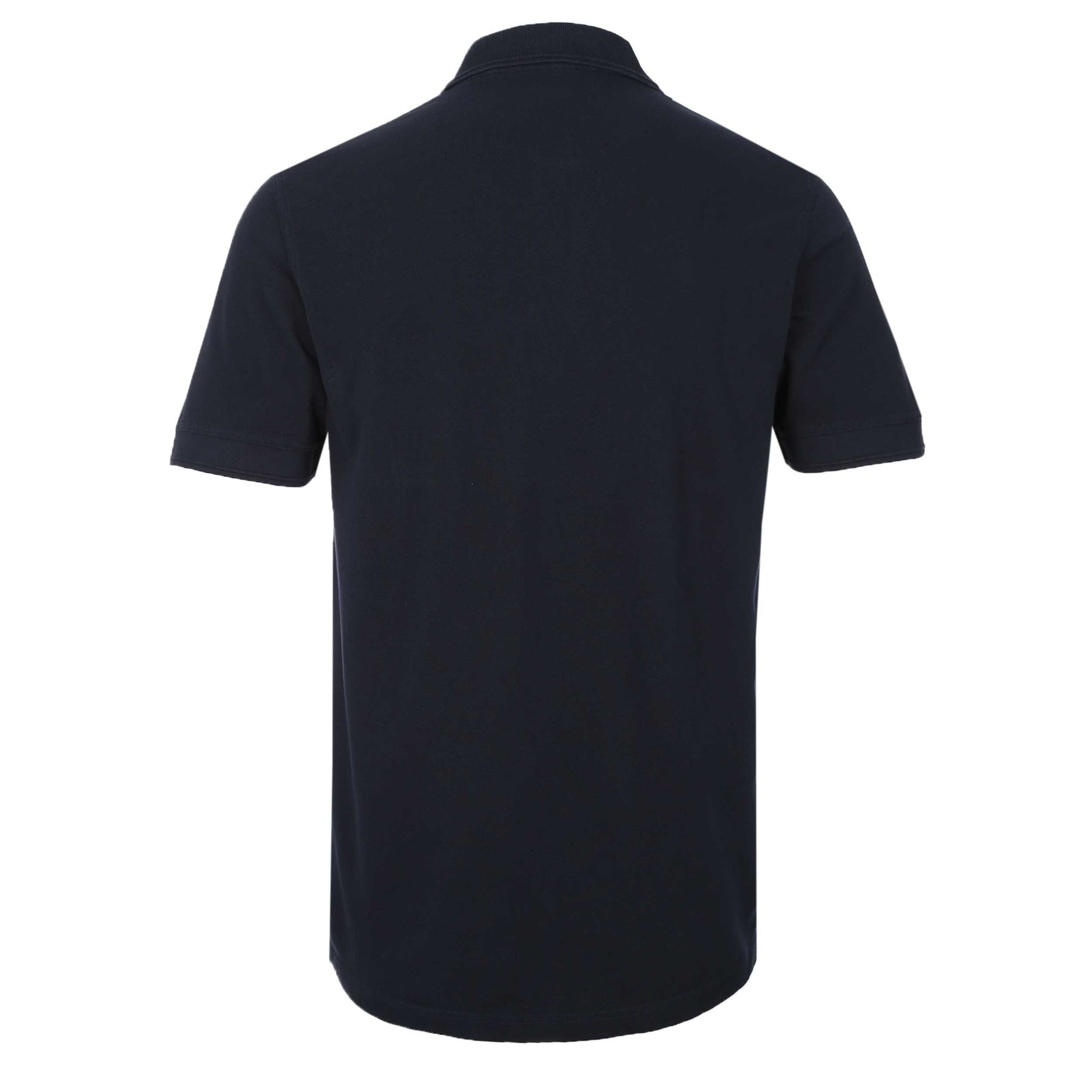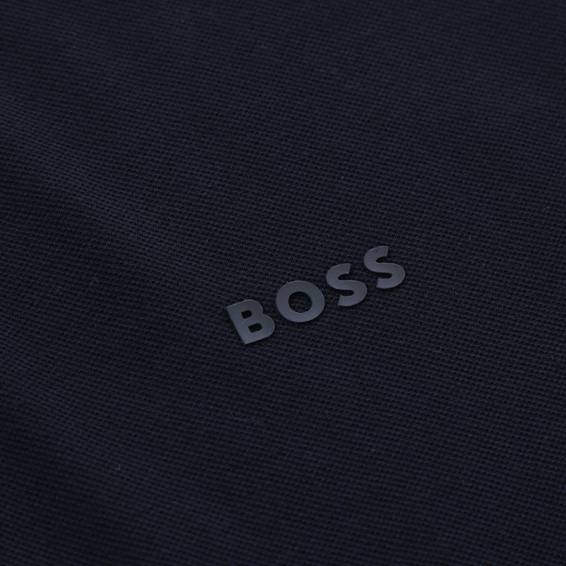 BOSS Prime Polo Shirt in Navy. A classic Hugo Boss polo shirt in a slim fit. A 2 button fastening placket. A BOSS polo shirt with flat knit collar and cuffs. Contrasting colour stripe detailing to the cuffs. Raised rubber logo to the left cuff.