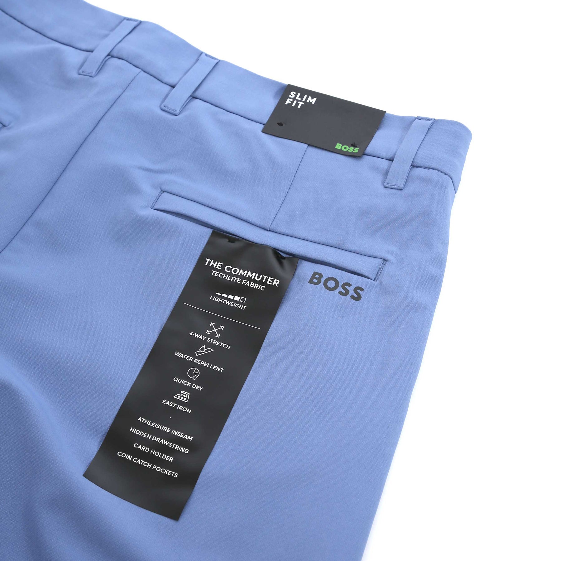 BOSS S Commuter 10.5 Inch Short in Light Pastel Blue. A regular fit short by BOSS. This 4 way stretch short arrives in a plain design with a regular rise. Featuring a partially elasticated waistband for comfort and a button fastening. 2 side slash pockets and 2 seat pockets. Hidden drawstring to the waistband. Can be teamed up with a t-shirt or shirt for those casual or smart occasions.
