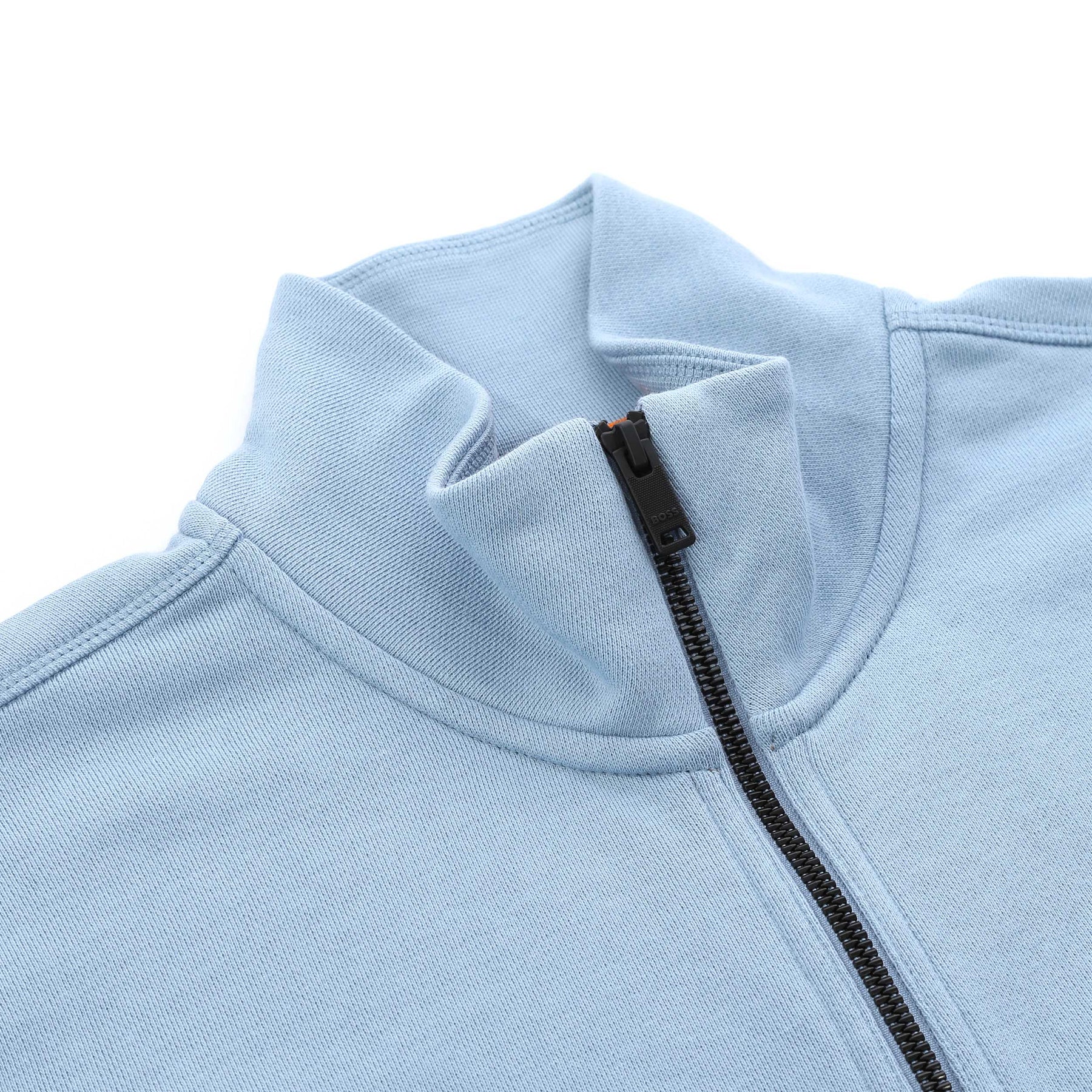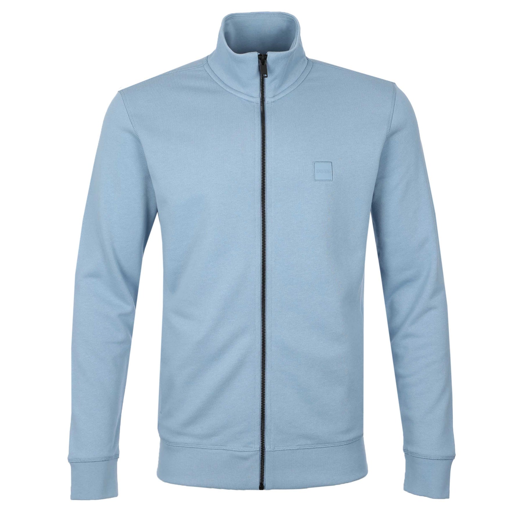 BOSS Zestart Sweat Top in Light Pastel Blue. A relaxed fitting BOSS sweatshirt. Featuring long sleeves, a full zip fastening and a stand up collar. Constructed from a French terry cotton. Two side-entry pockets to the front. Finished with a BOSS logo patch on the chest.