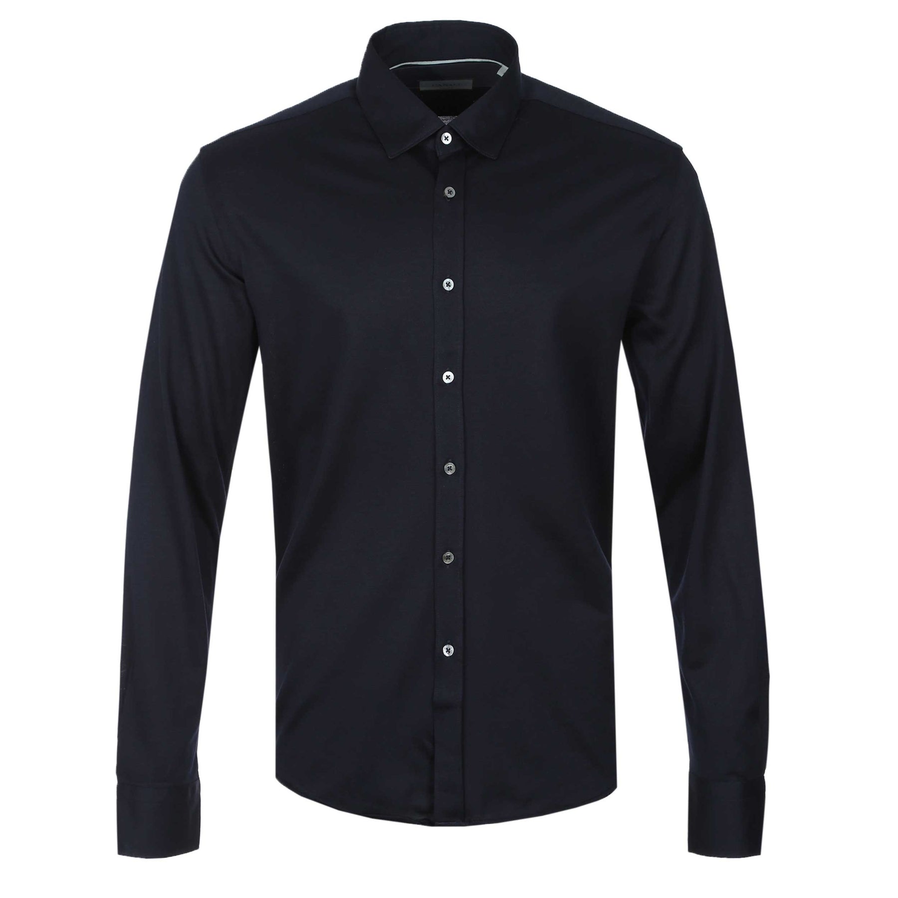 Canali Basic Stretch Shirt in Navy. Long sleeve shirt by Canali cut to a slim fit. This classic shirt arrives in a plain design with a full button fastening placket. Stretch properties to the shirt. Soft pointed collar.