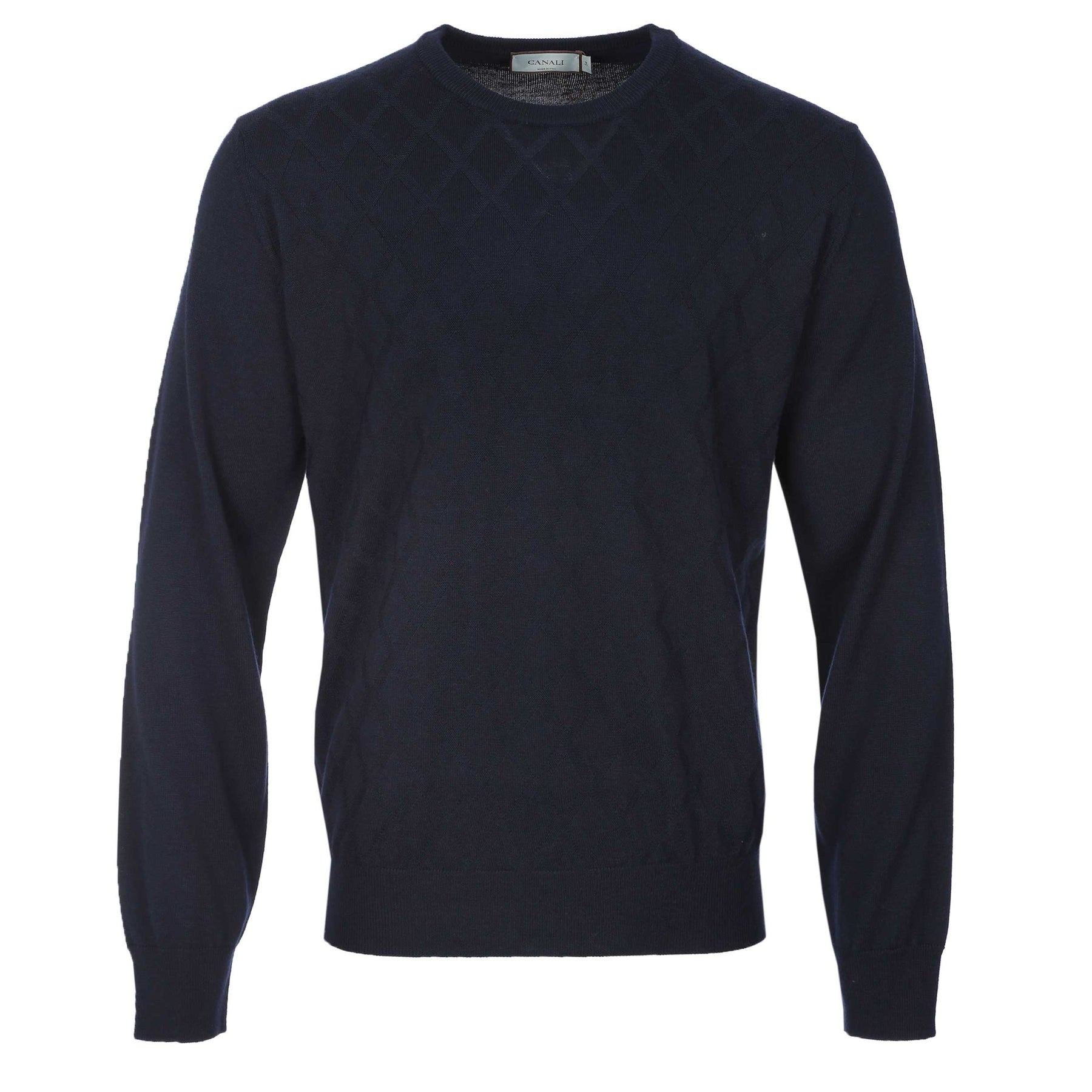 Canali Crew Neck Diamond Print Knitwear in Navy. Knitwear by Canali in a regular fit. Classic crew neck styling with long sleeves. Textured diamond design knitwear. Ribbed collar, cuff and hem. Perfect to be worn on its own or to layer up.