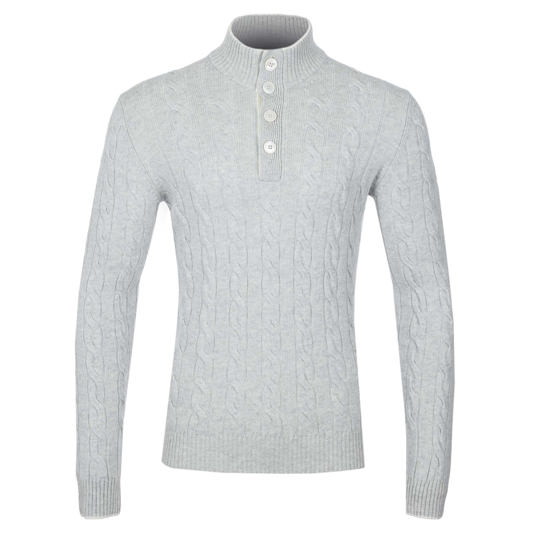 Gran Sasso 4 Button Chunky Cable Knitwear in Light Grey. This button mock neck sweater is crafted from a refined wool–cashmere blend for warmth, softness and a luxurious feel. Designed with hammer sleeves and a classic cable-knit pattern, it delivers rich texture and a modern silhouette. A timeless wardrobe essential, it works effortlessly over a T-shirt for a relaxed look or layered with a shirt for a sharper, more formal style. Cut in a fashion fit, it’s a versatile men’s knit built for smart-casual dressing all season.