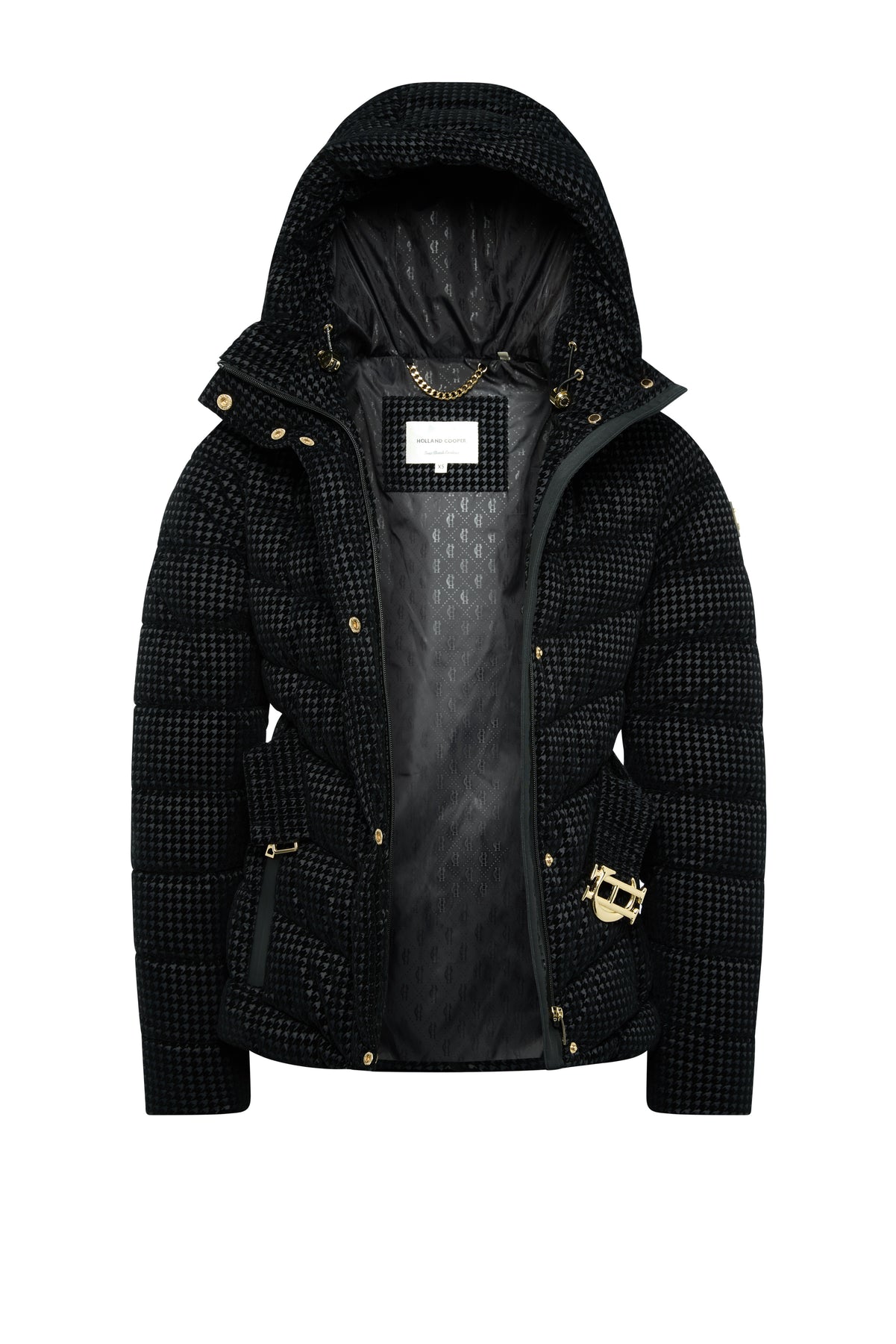 The Arosa Jacket features an oversized hood that adds a touch of drama and extra protection against the elements. Its quilted design, crafted with a soft velour touch houndstooth pattern, not only looks stylish but also ensures comfort in cold weather. The full zip fastening, complemented by a hand-plated gold Holland Cooper signature logo buckle waist belt, allows you to tailor the fit according to your preference, making it as chic as it is functional.