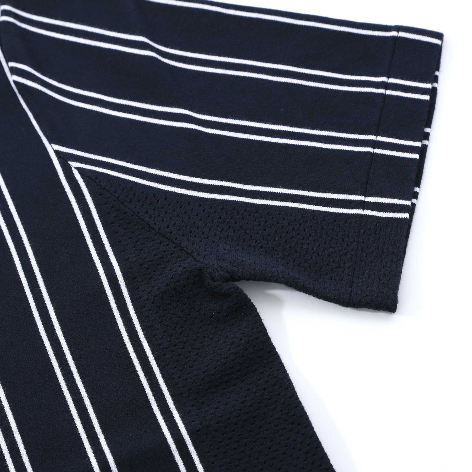 Featuring ribbed stripe detailing, engineered mesh inserts for enhanced airflow and a structured flat knit collar, this men’s short sleeve knit shirt delivers both performance and polish. The breathable construction makes it ideal for hot city days, summer evenings and holiday wear, while maintaining a sharp, tailored silhouette.