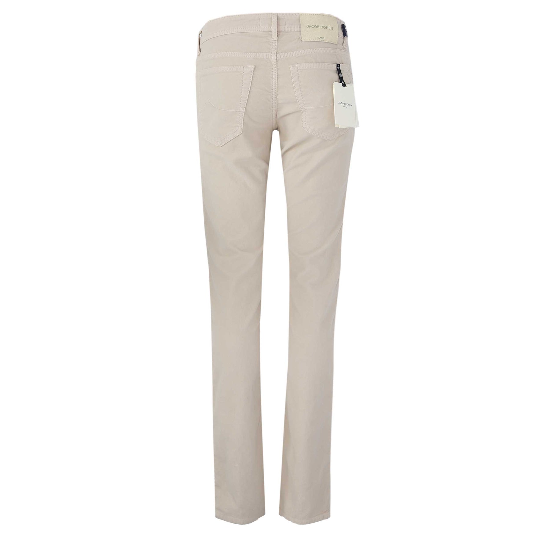 Jacob Cohen Bard Beige Badge Moleskin Jean in Winter White. A high quality, brushed moleskin trouser by Jacob Cohen. They feature a 5 pocket jean style and a Jacob Cohen suede brand badge to the rear. Zip fly fastening with embroidered detailing. Trouser is treated using extraordinary techniques creating vintage looks by means of abrasion, washing, embroidery all preformed in-house by hand.