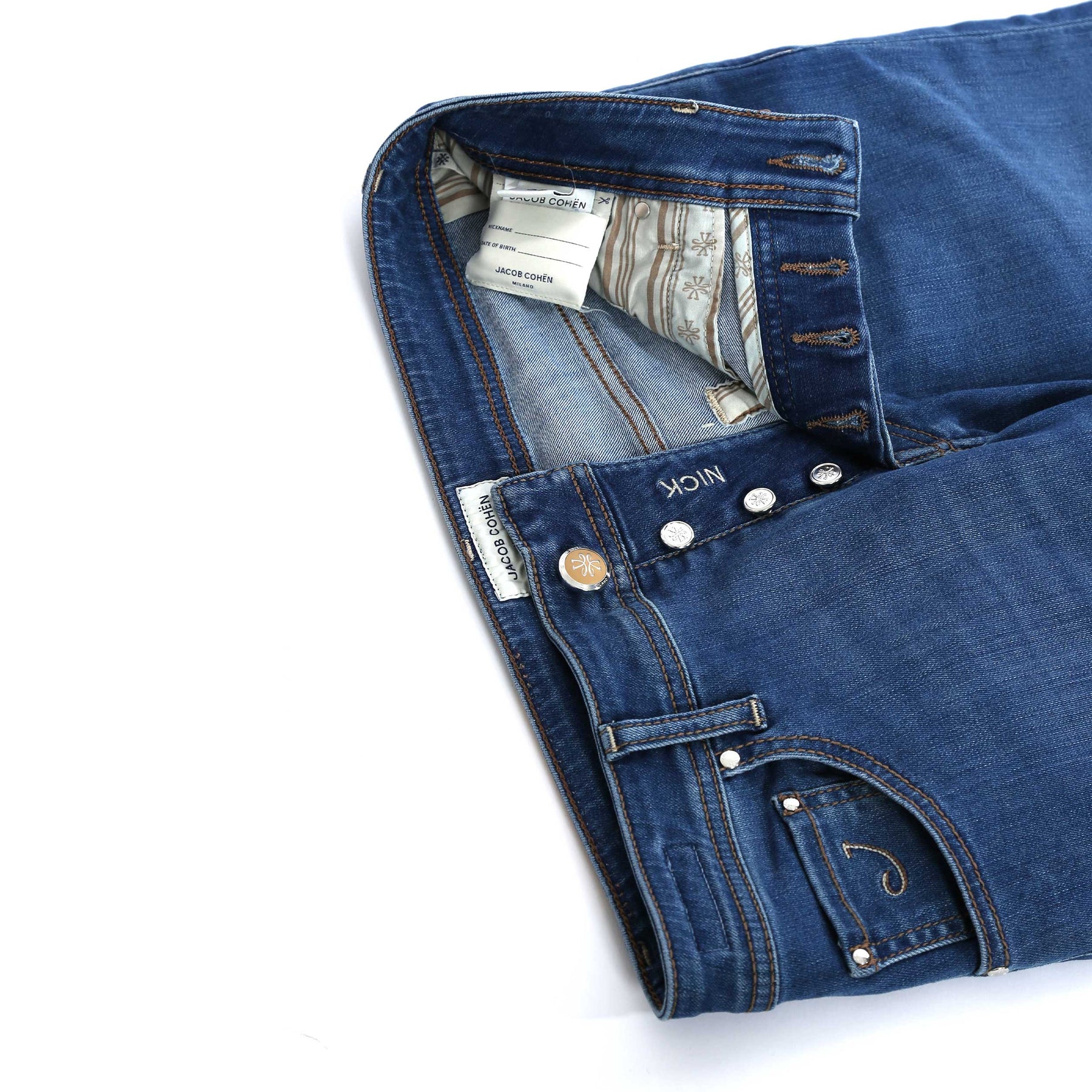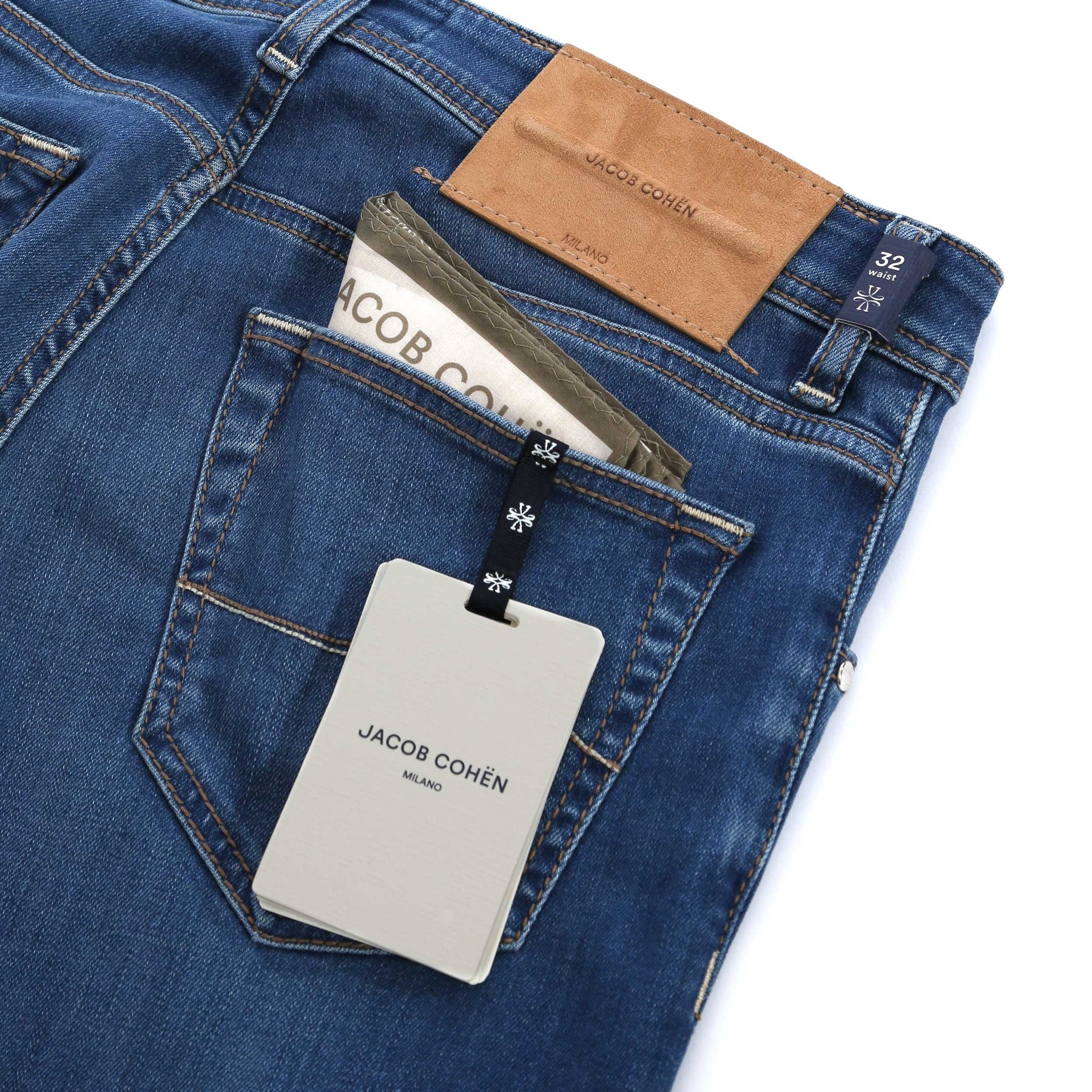Every aspect of the jean is meticulously crafted, from the premium materials used to the hand-finished detailing. The standout feature of this jean is the distinctive burgundy horse hair badge on the rear pocket, a hallmark of Jacob Cohen's commitment to quality and originality. This badge not only enhances the aesthetic but also signifies authenticity and luxury.