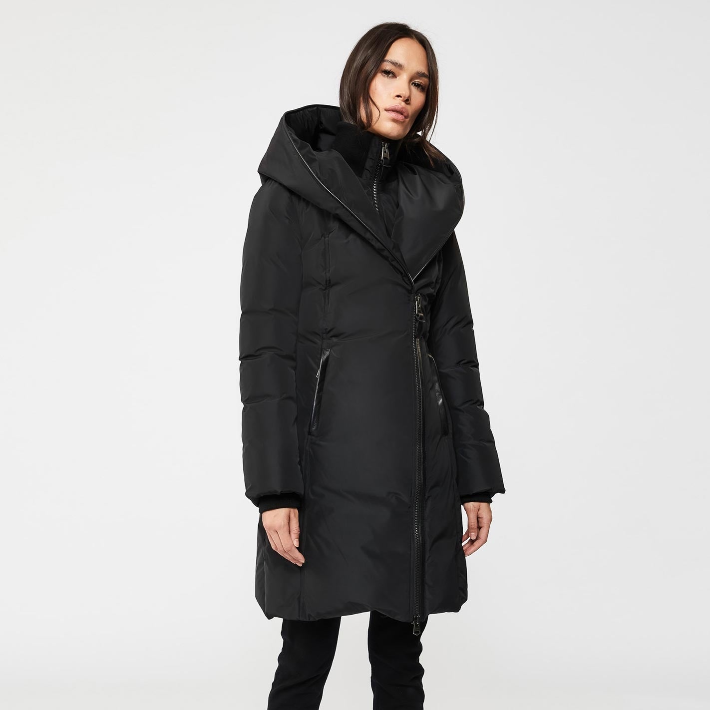 Mackage Kay-NFR Ladies Jacket in Black. True to size fit jacket with water repellent properties. This knee length jacket has a teardrop hood and a tailored waist. Full length zip with 2 zip closure pockets. Mackage logo to the hood and sleeve. Leather trim detailings throughout. Elegent tear drop shape to the hood makes this jacket distinctive.