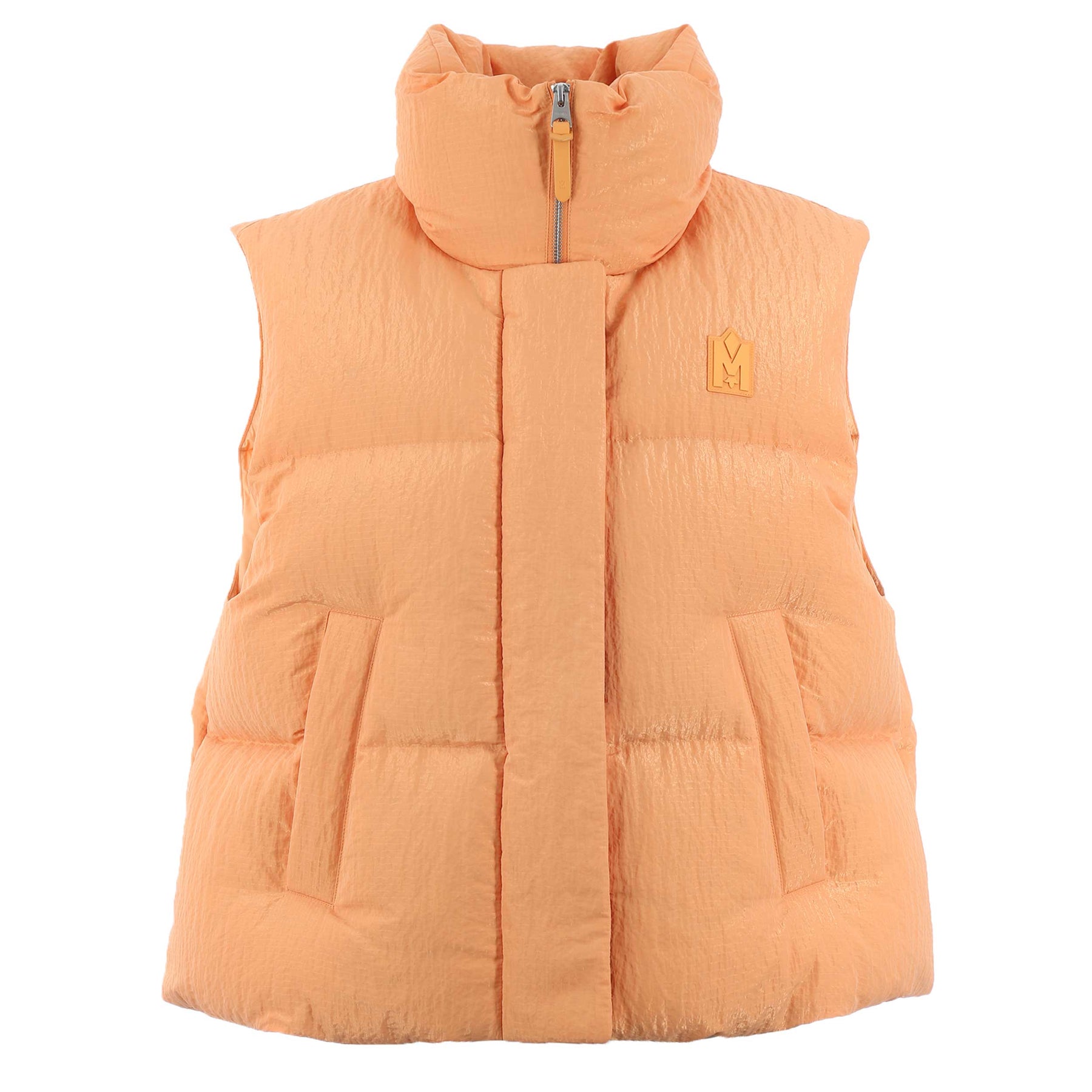 Mackage Naki Ladies Gilet in Smoke Orange. Oversized gilety by Mackage. Lightweight gilet constructed from a tactical ripstop fabric. NAKI features a stand collar and insulated zip waist pockets, delivering protective warmth on the chilliest days. It is water resistant and repellent, while the breathable fabric prevents overheating. Mackage logo badge to the chest.