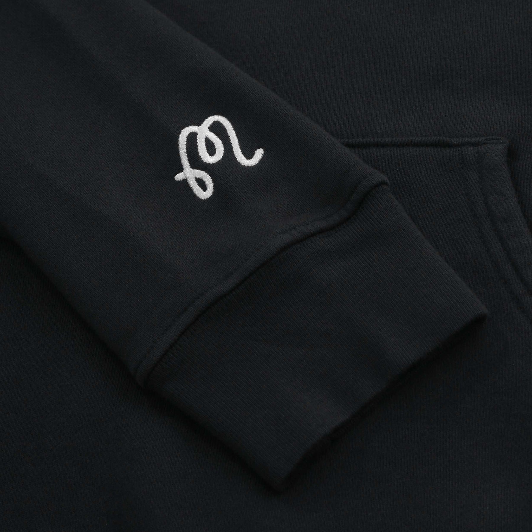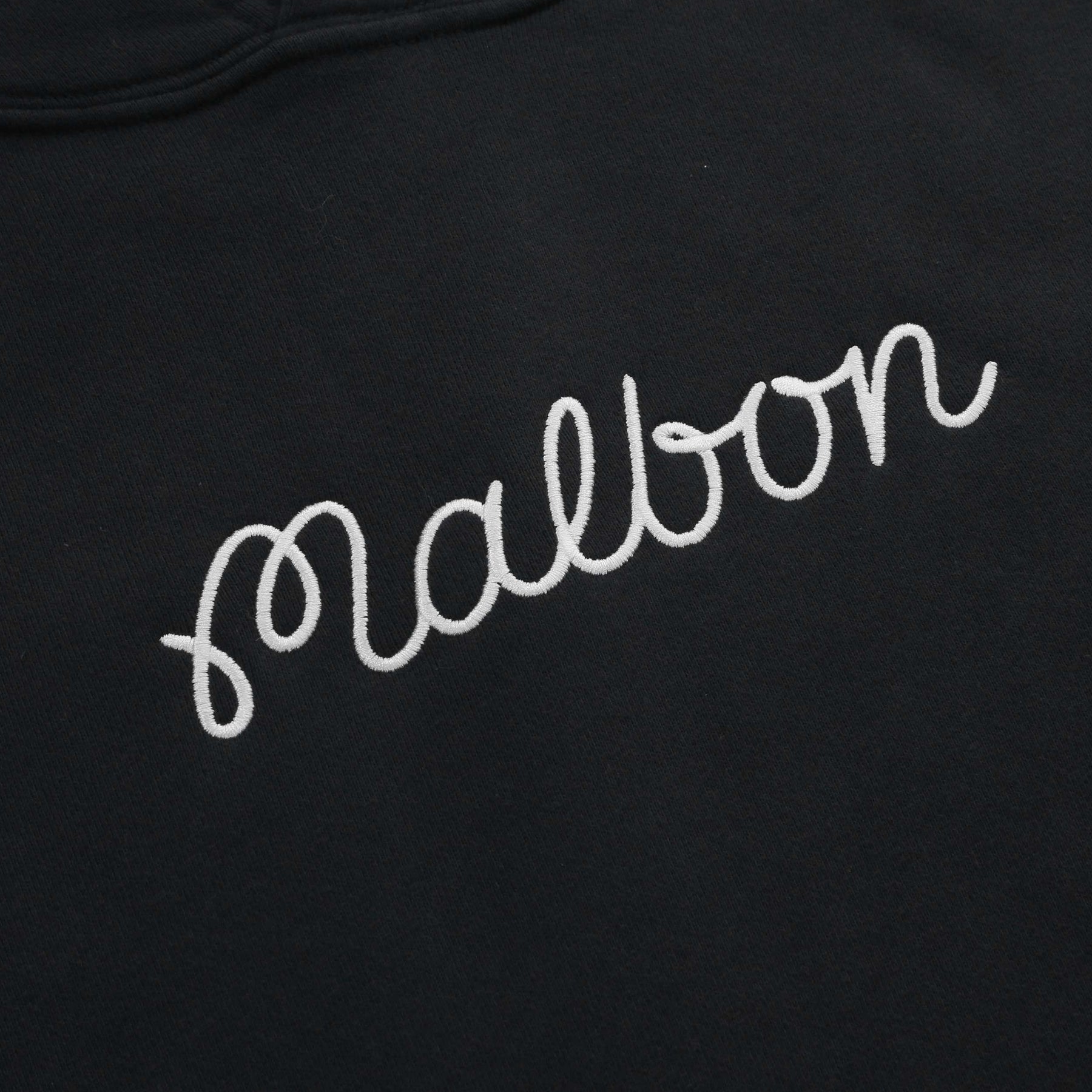 Malbon Fesque Hoodie Sweatshirt in Black. Hoodie sweatshirt by Malbon. This over the head sweatshirt has a contrasting Malbon script logo embroidered to the chest and right cuff. Kangaroo pocket to the front. Ribbed cuff and waistband.