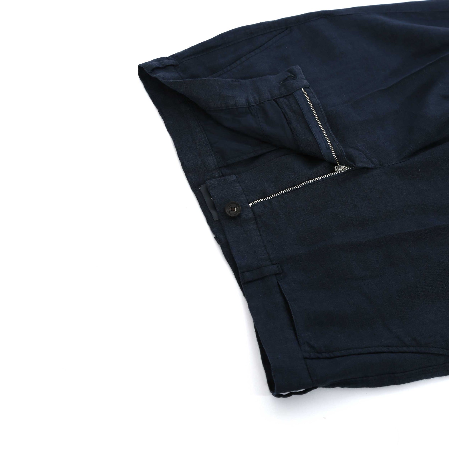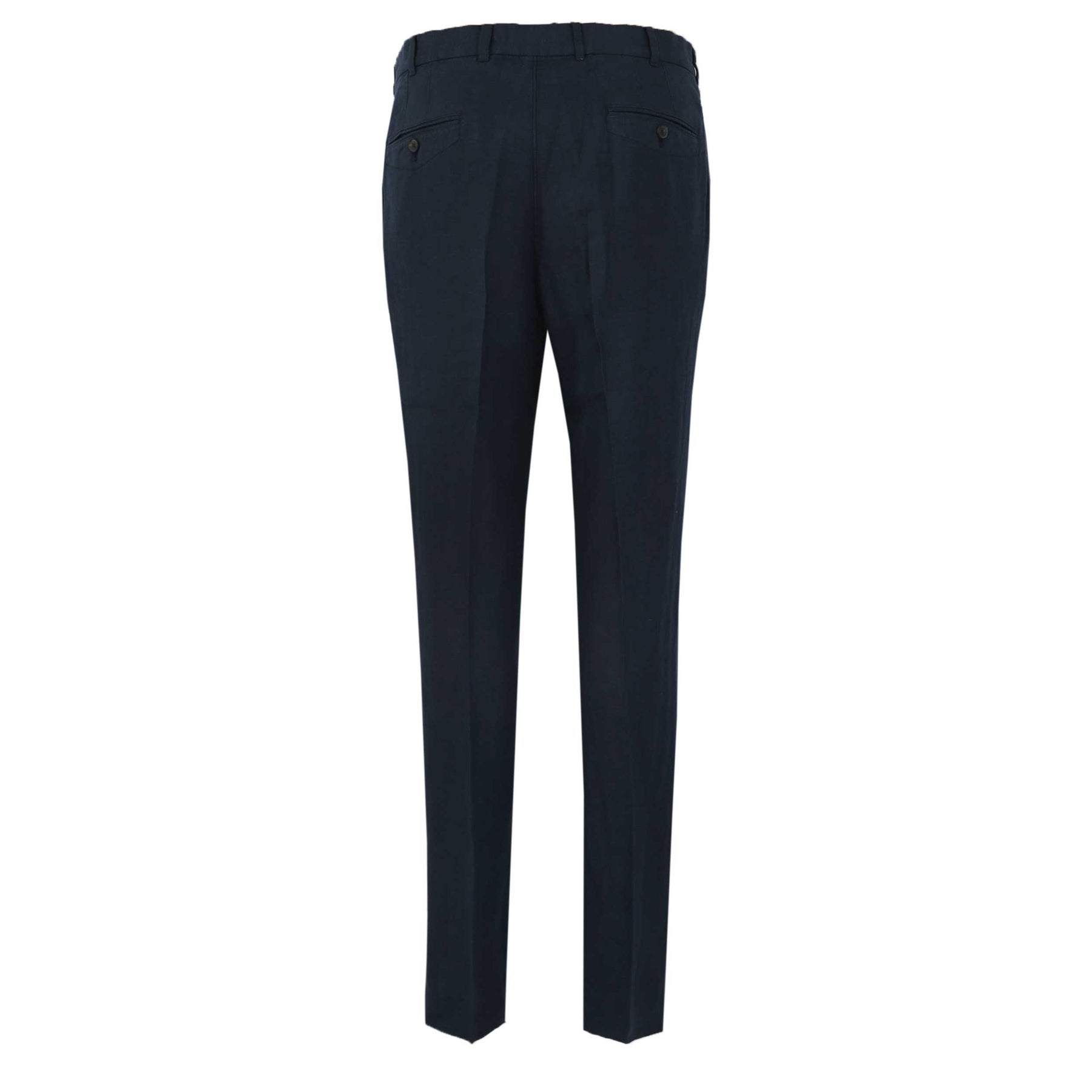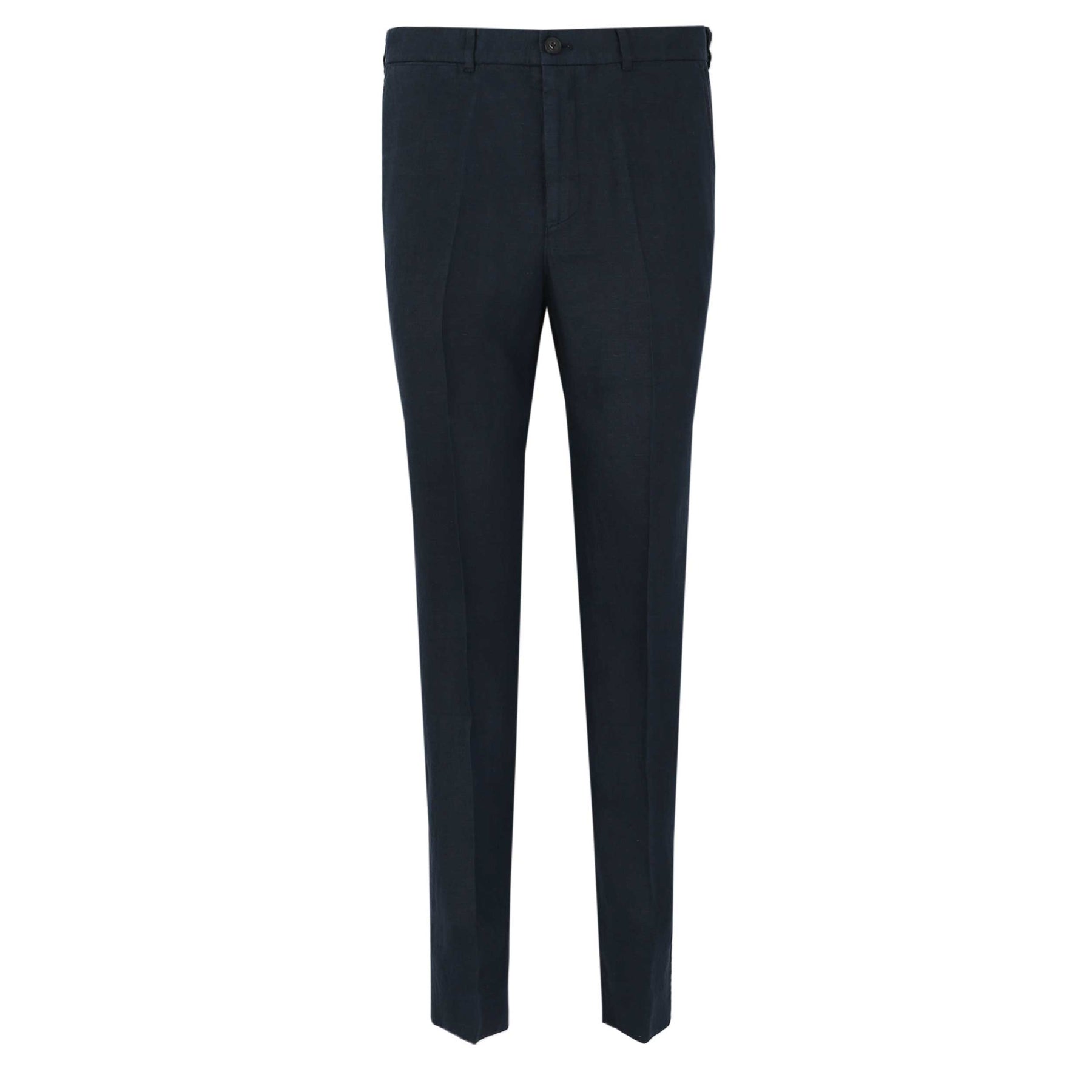 Oliver Sweeney Kettleburgh Linen Trouser in Dark Navy. Crafted for effortless warm-weather dressing, these summer trousers are cut from premium 100% linen woven at the renowned Troficolor mill in Portugal. Lightweight and breathable, the fabric delivers natural texture and comfort while maintaining a refined finish. Designed in a semi-casual silhouette, they feature a subtle taper through the leg with a sharp front crease for a clean, tailored line. A classic zip fly waistband with belt loops ensures versatility, while two slanted front pockets and reinforced rear jetted pockets add practicality without compromising shape. Natural horn buttons complete the detailing.