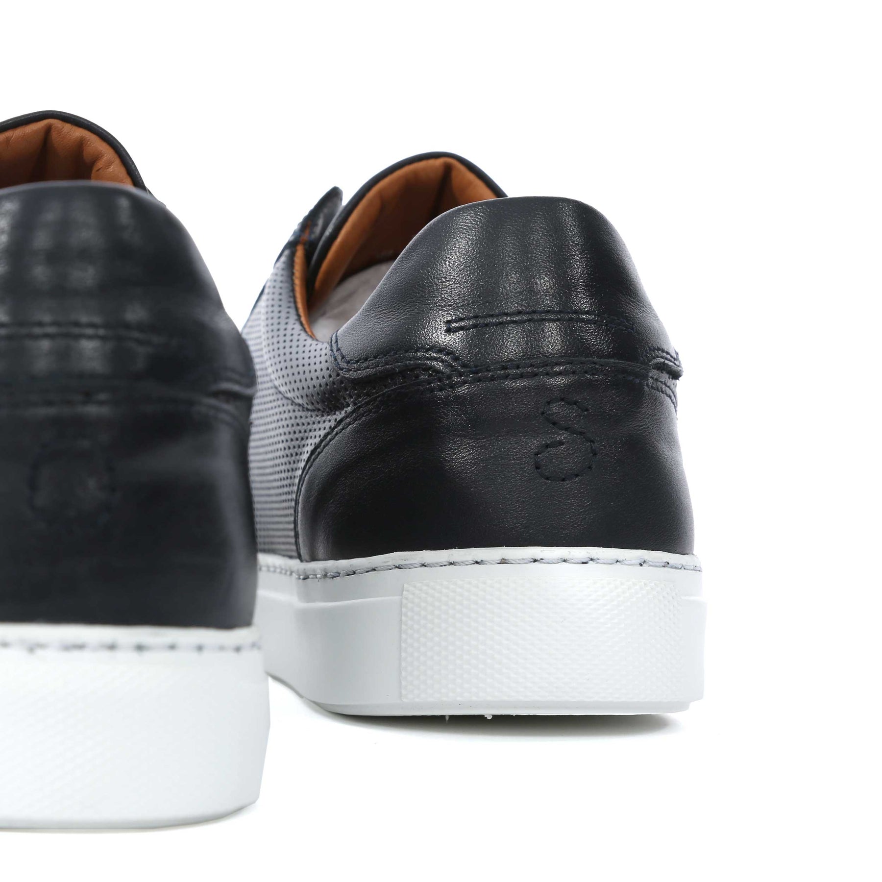 Oliver Sweeney Valezim Trainer in Navy. A handmade trainer by Oliver Sweeney. This slip on leather trainer has a plain design with an elasticated strap for a secure and perfect fit. Perforated side panel detailing with a contrasting white sole. Padded collar. Embroidered tonal stitch logo to the heel panels. Signature Oliver Sweeney logo to the sole unit. A smart trainer to compliment jeans or shorts.
