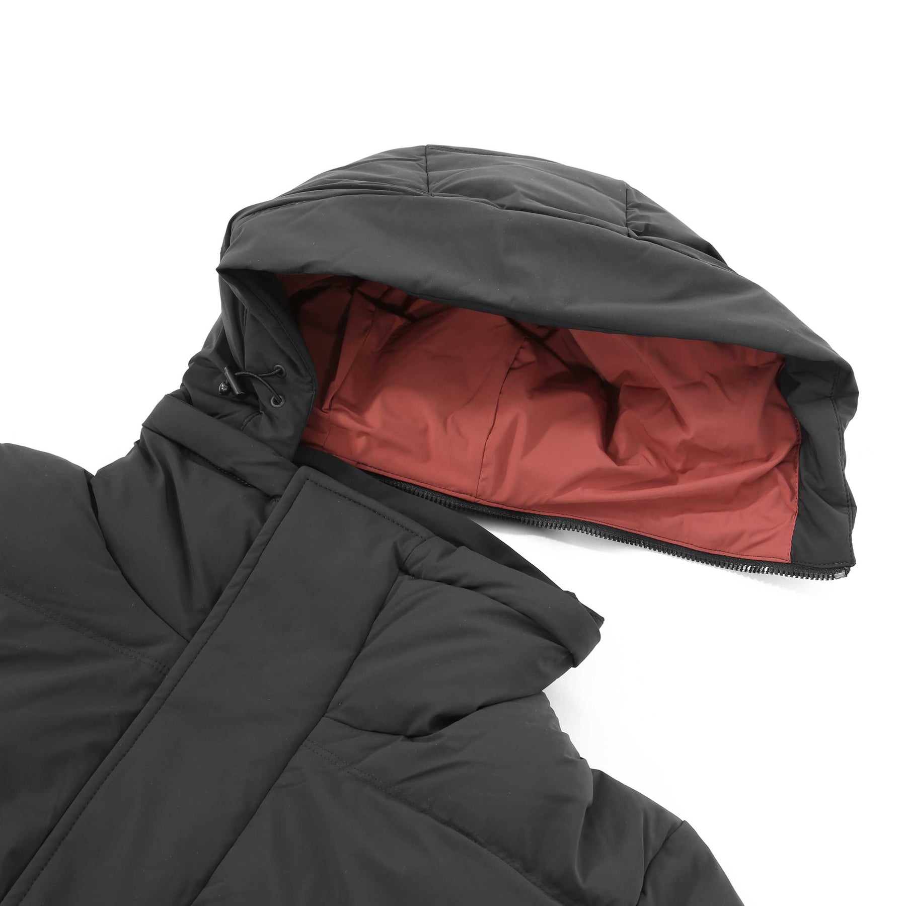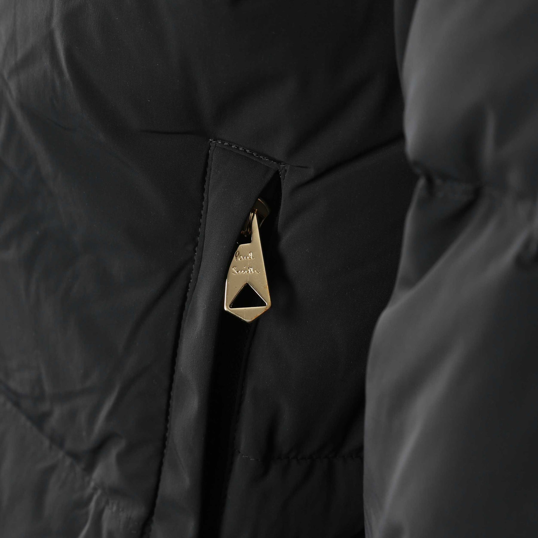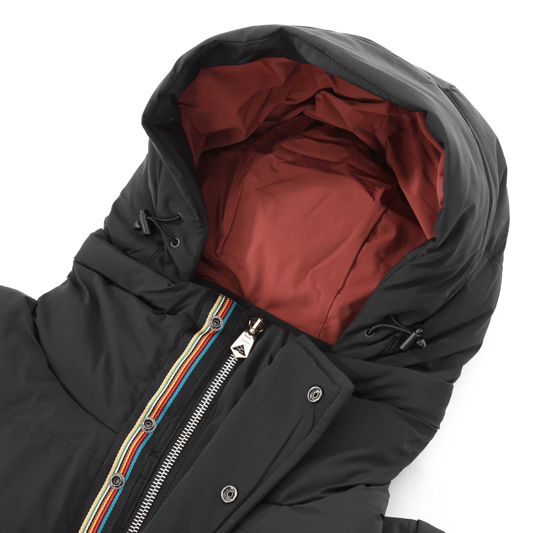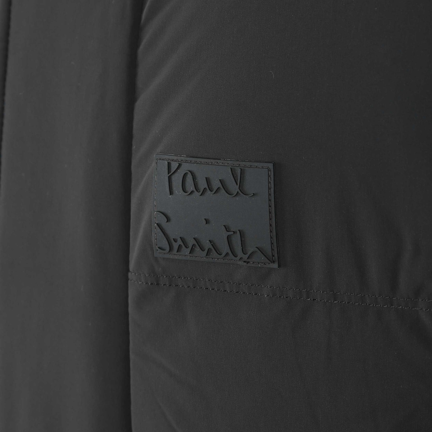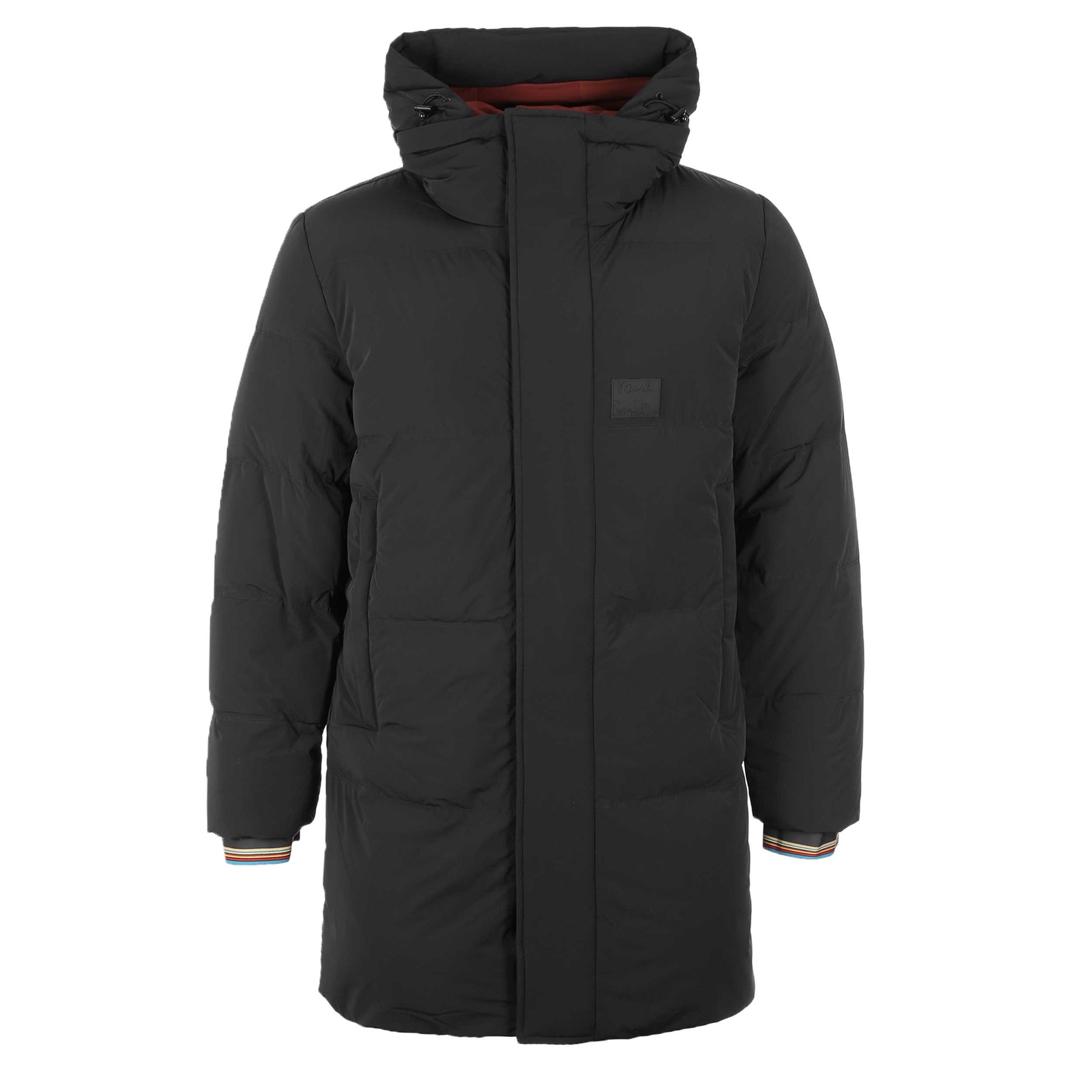 Paul Smith Hooded Down Jacket in Black Melange. A quilted parka style jacket by Paul Smith. A full zip fastening jacket with the iconic Paul Smith multi-coloured contrasting trim to the inside of the zip placket. Two front pockets with zip fastening. Elasticated cuffs with Paul Smith multi-coloured contrasting trim. Removable hood with elasticated drawstrings. Tonal Paul Smith logo badge to the chest.