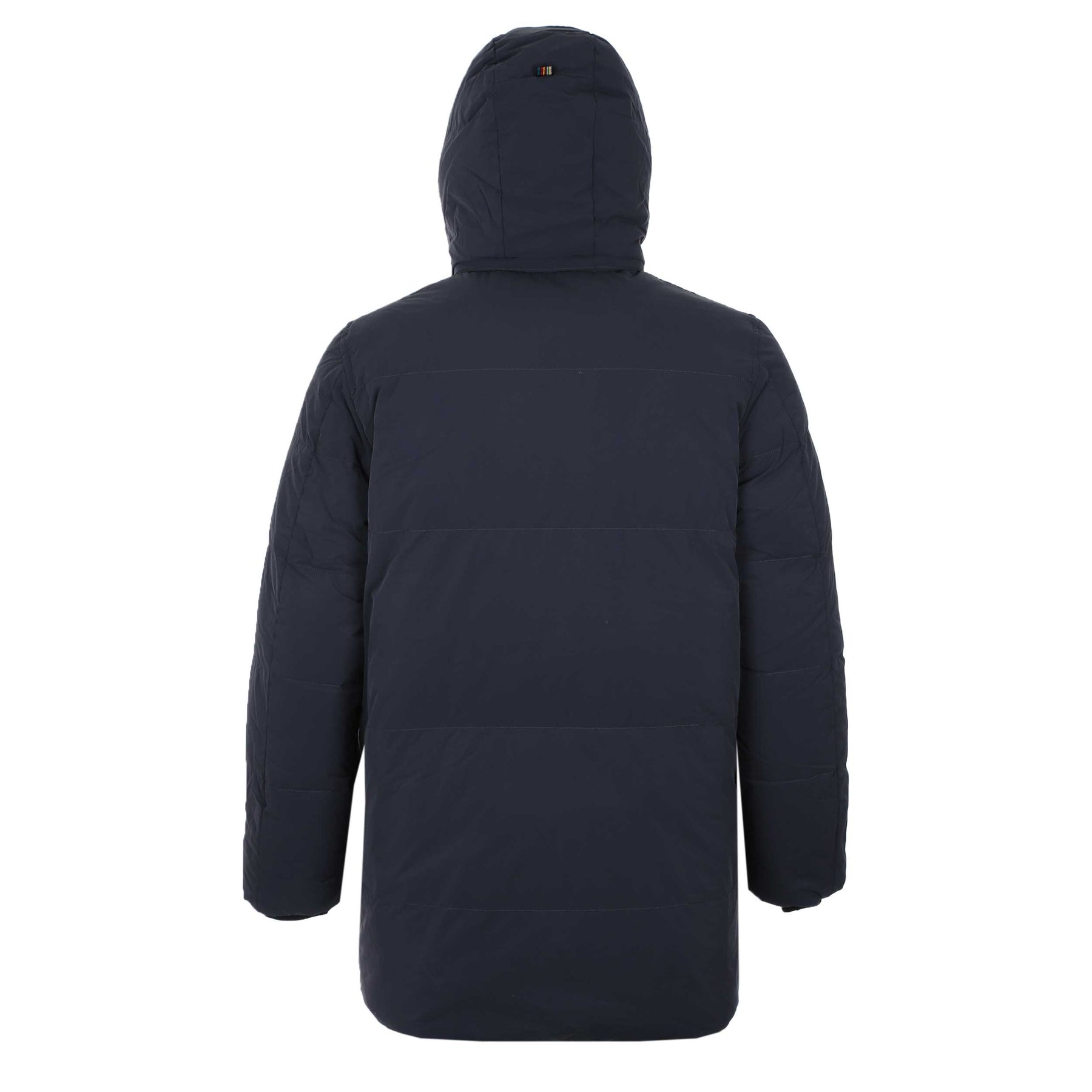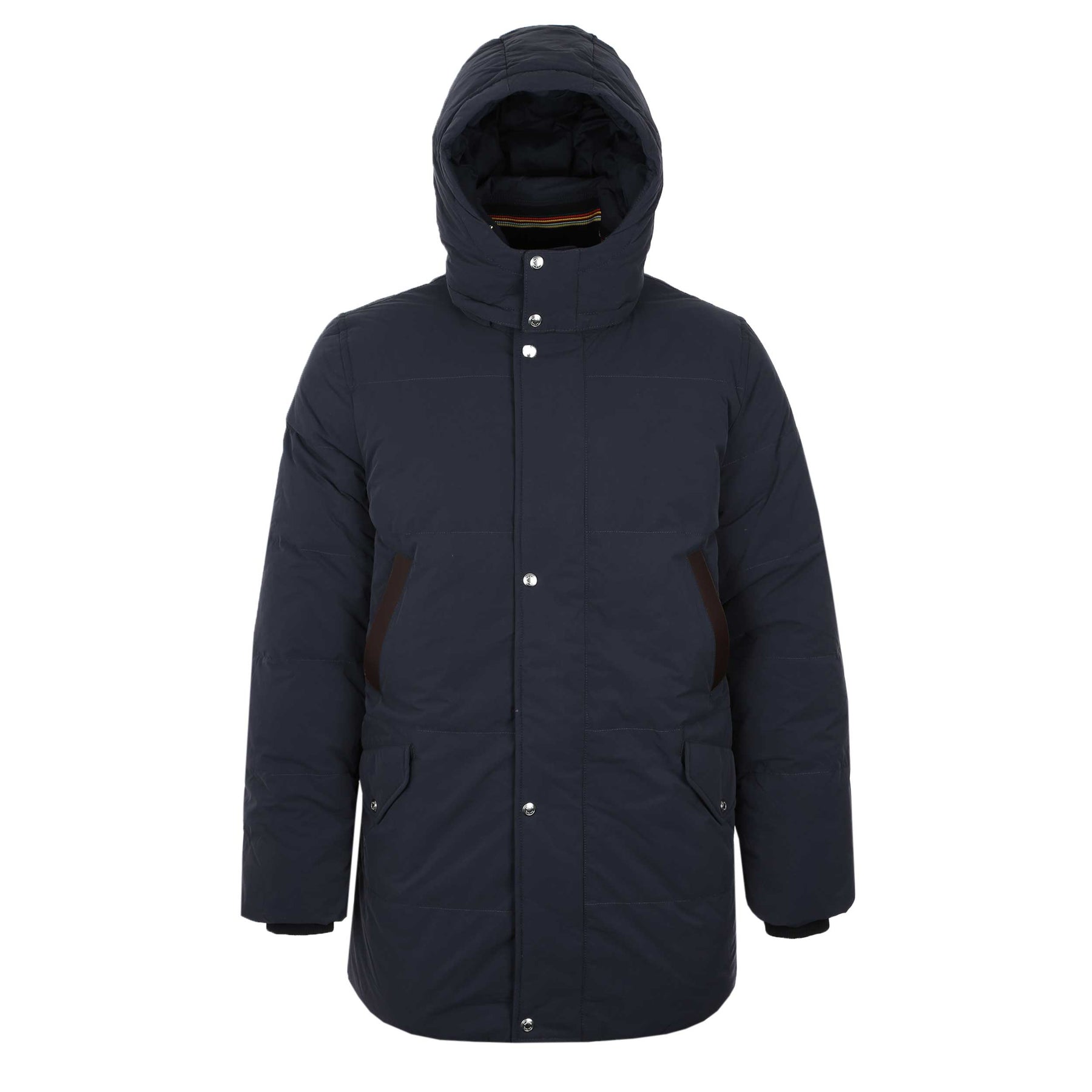 Paul Smith Hooded Down Jacket in Navy. Crafted from a lightweight polyamide shell, this navy long parka delivers reliable protection against wind and rain thanks to its water-repellent finish. Filled with insulating down for superior warmth without bulk, it’s designed to keep you comfortable in colder conditions. A detachable hood adds versatile styling and extra defence from the elements, while the clean, modern silhouette makes it an ideal outerwear choice for both city wear and weekend escapes.