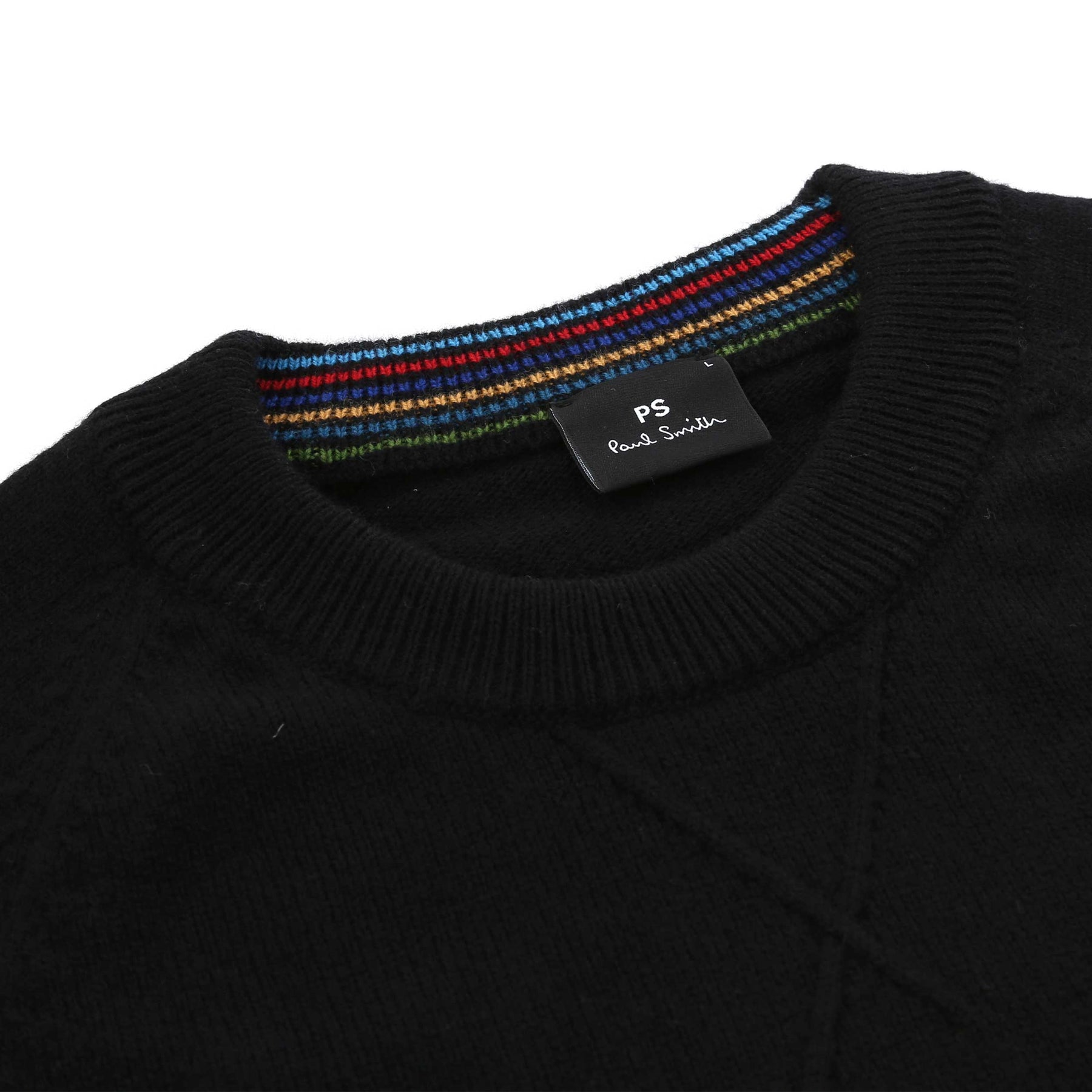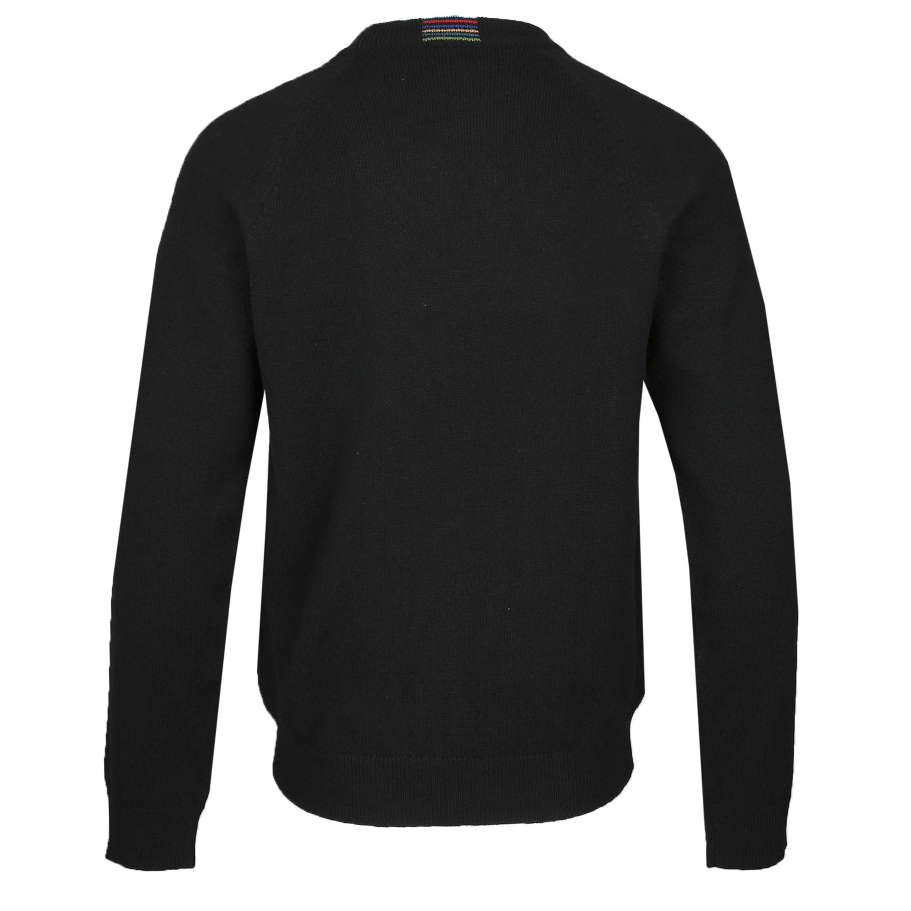 The sweater features a classic crew neck design, making it a versatile addition to any outfit. The long sleeves provide added coverage, while the ribbed collar and cuffs ensure a snug fit. The unique multi-coloured trim on the inside of the neckline is a hallmark of Paul Smith's attention to detail, adding a pop of colour to the otherwise sleek black exterior. Additionally, the striking multicoloured stripe design at the back of the neckline lends a subtle twist that sets this sweater apart from the crowd.