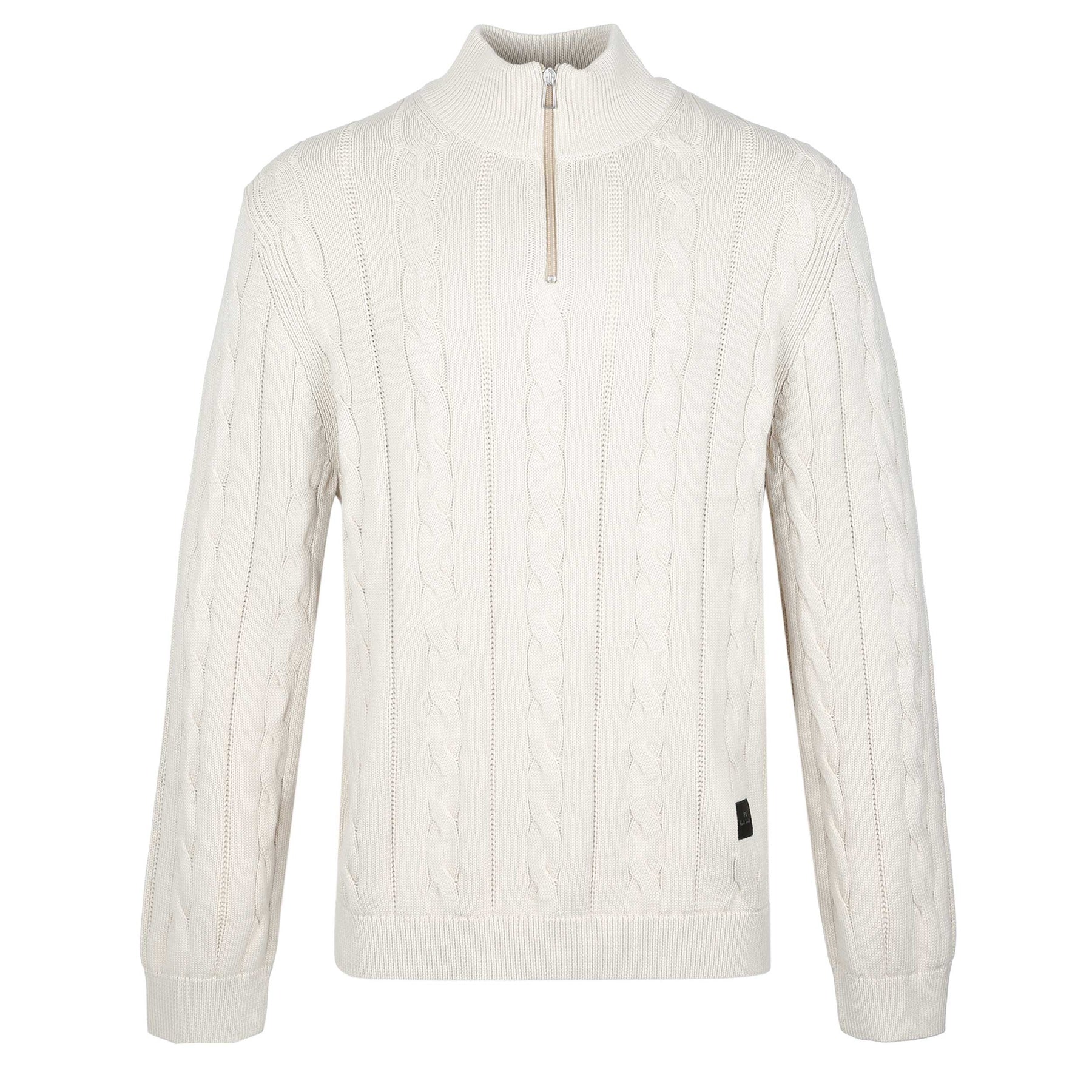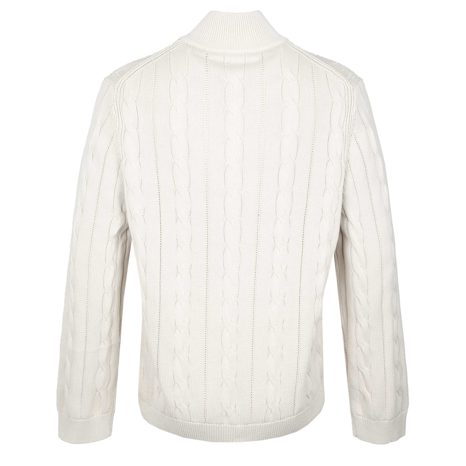 Discover the elegance and sophistication of the Zip Neck Sweater Knitwear in Beige. Crafted from 100% organic cotton, this cable knit style knitwear addition embodies both comfort and luxury, making it a perfect choice for the modern gentleman.