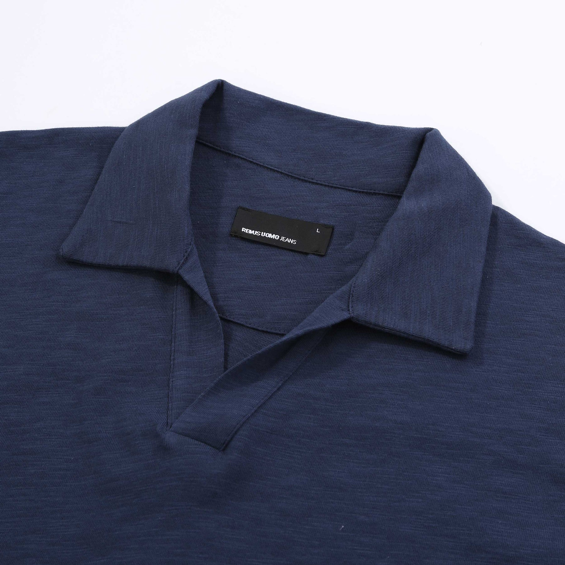 Remus Uomo Skipper Collar Slub Polo Shirt in Navy. Tapered-fit open-collar polo, crafted from soft single jersey slub yarn. Made from 100% cotton, this lightweight and breathable polo is the perfect choice for effortless spring and summer wear.