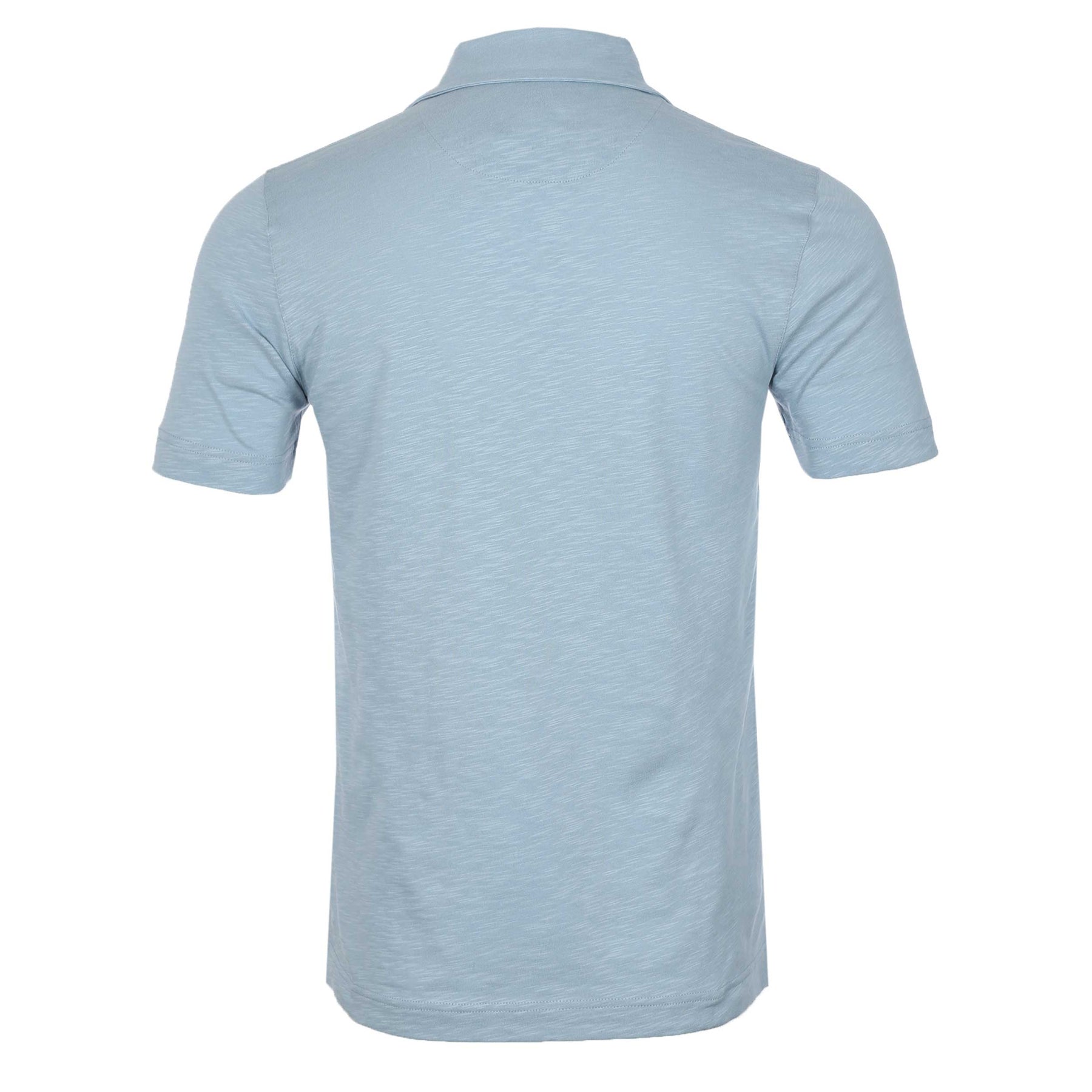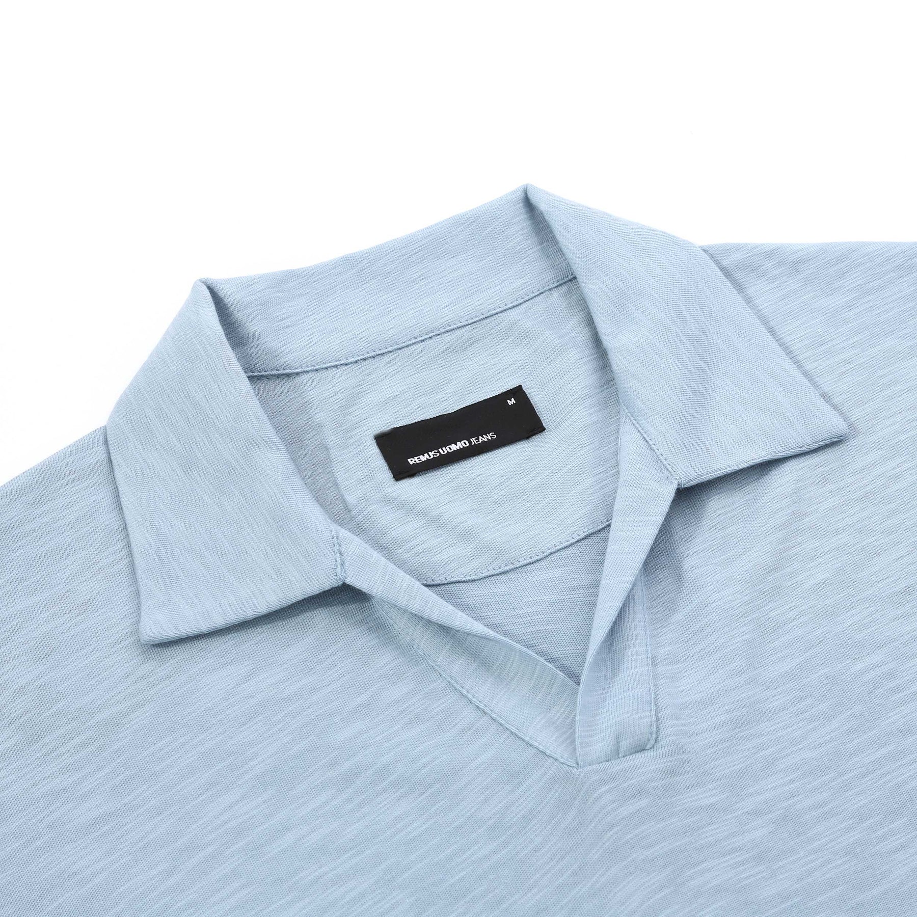 Remus Uomo Skipper Collar Slub Polo Shirt in Sky Blue. Tapered-fit open-collar polo, crafted from soft single jersey slub yarn. Made from 100% cotton, this lightweight and breathable polo is the perfect choice for effortless spring and summer wear.