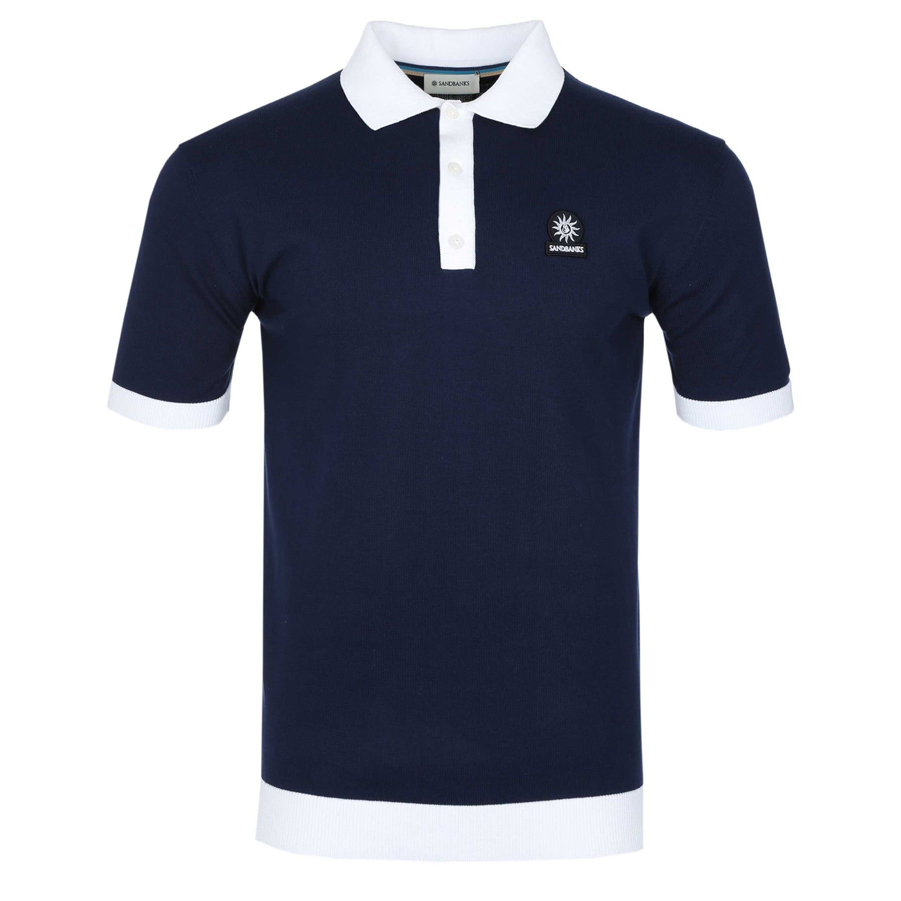 Sandbanks 3 Button Knitted Polo Shirt in Navy. Knitted polo shirt by Sandbanks. A regular fitting polo shirt with short sleeves. 3 button placket to the polo shirt. Solid contrasting colour collar, cuffs, waistband and placket. Constructed from an organic cotton for a luxurious feel. Plain design polo shirt with a Sandbanks logo badge to the chest.