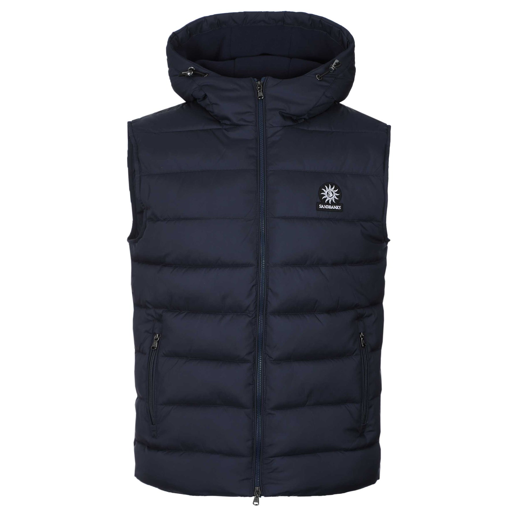 Sandbanks Frontier Micro Puffer Gilet in Navy. The Sandbanks Frontier Hooded Puffer Gilet in Navy is a lightweight, sustainably crafted layer made almost entirely from recycled plastic bottles. Designed for warmth without the bulk, it features a soft micro-polar fleece lined hood with adjustable cords, a premium 2-way YKK Vislon front zip and fleece-lined YKK coil side pockets for everyday comfort. Finished with the signature Sandbanks embroidered chest badge, this gilet delivers clean, modern style. Perfect for layering through the colder months.