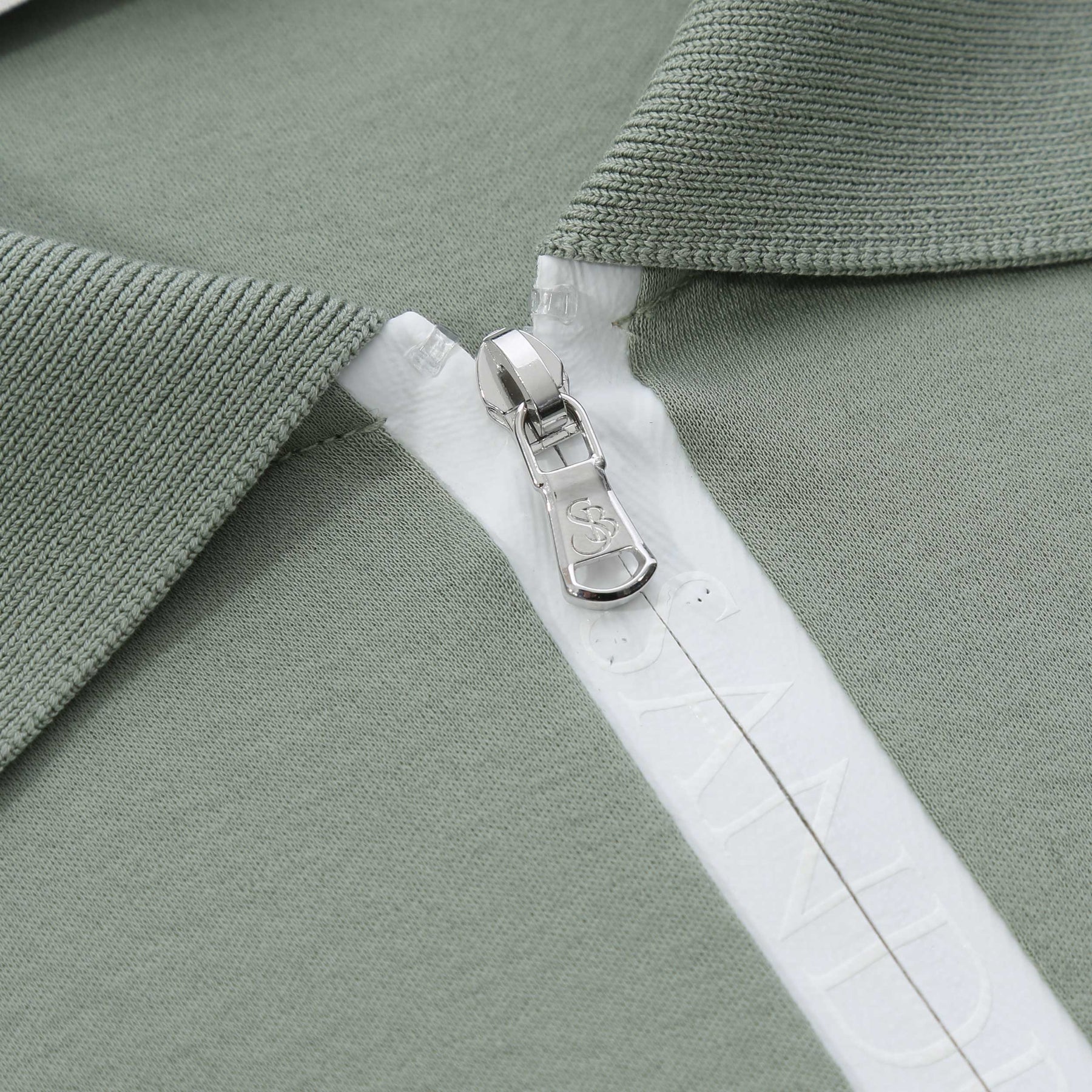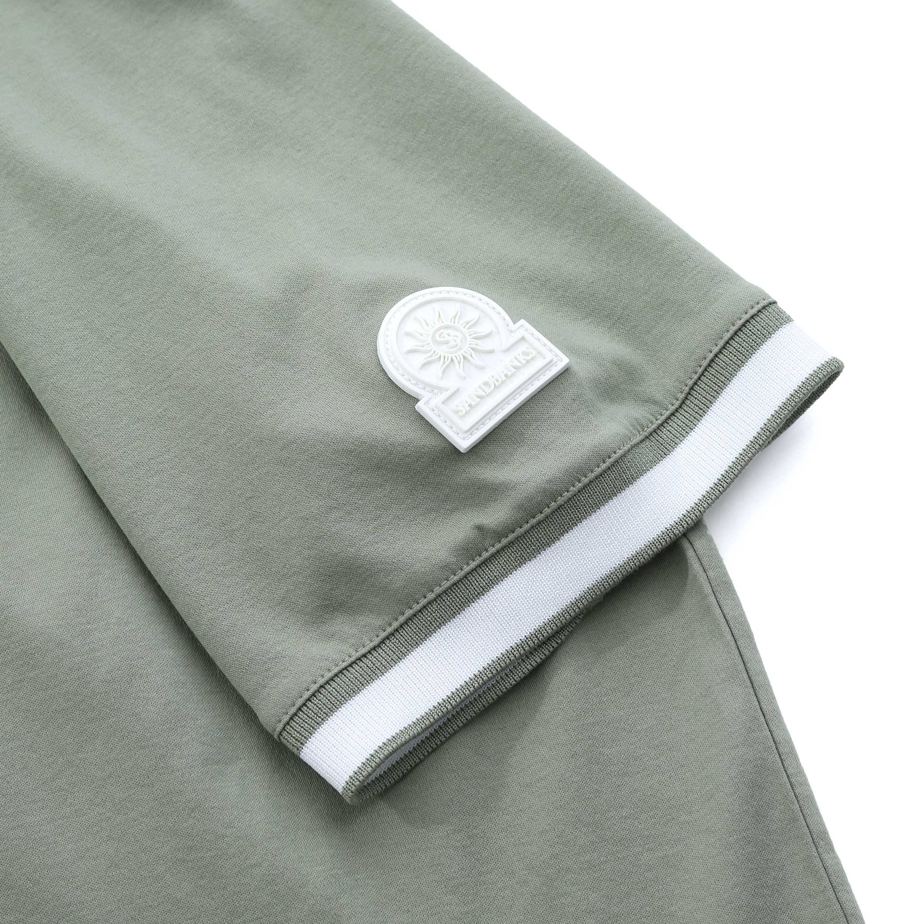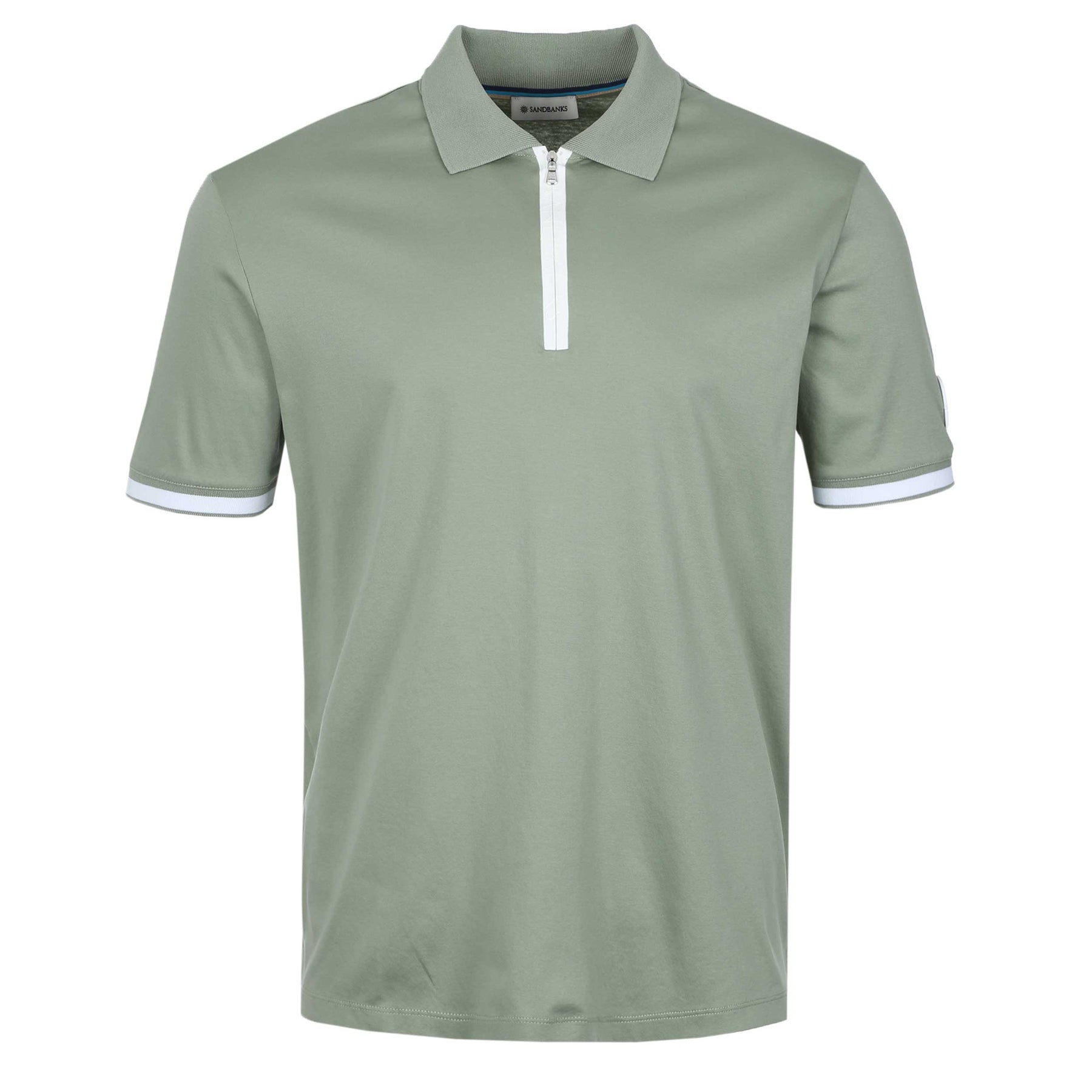 Sandbanks Silicone Zip Polo Shirt in Sage. Polo shirt by Sandbanks. A regular fitting polo shirt with short sleeves. Classic style polo collar with a zip fastening placket. Contrasting colour trim to the cuffs. Constructed from a mercerised cotton for a luxurious feel. Sandbanks rubberised logo to the sleeve.