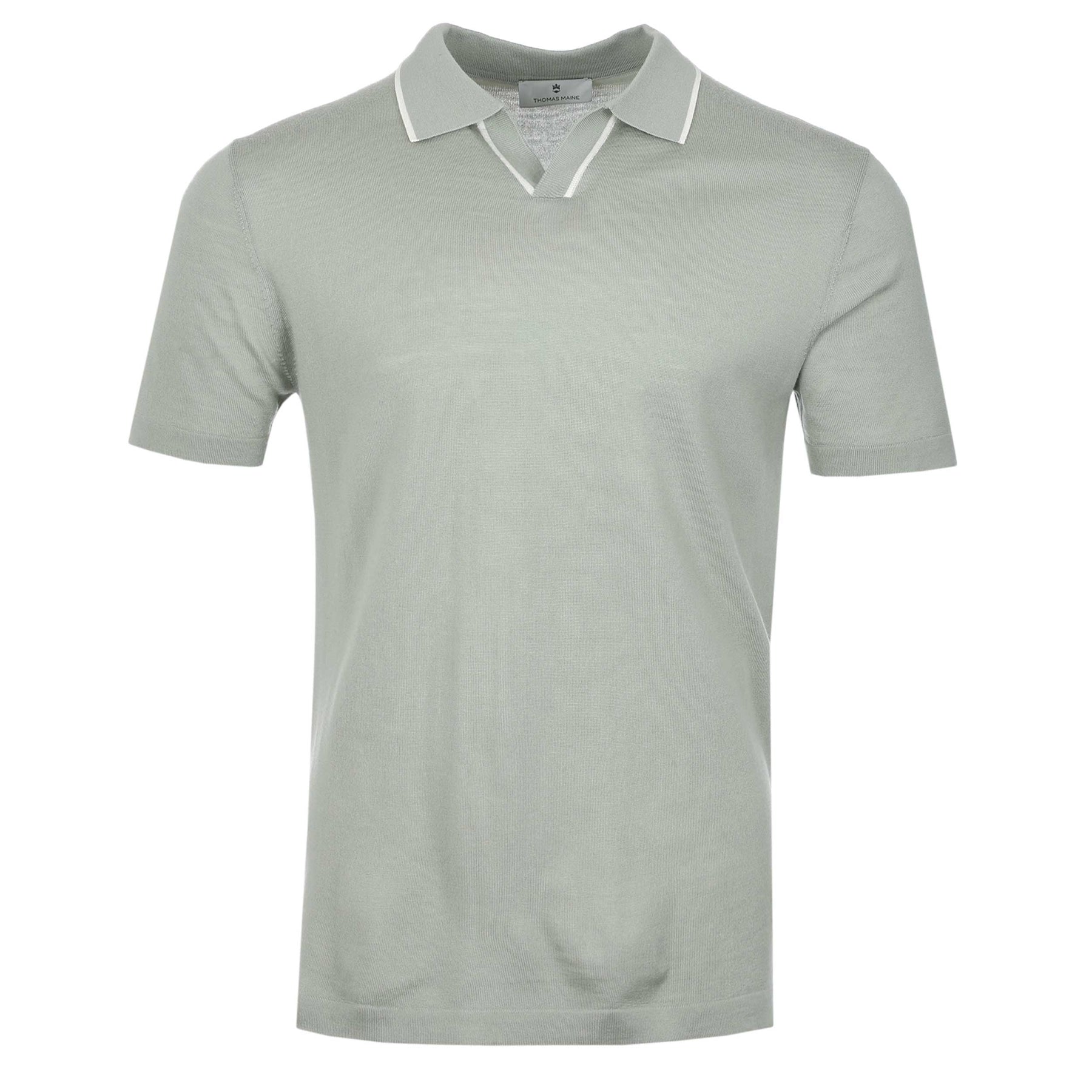 Thomas Maine Skipper Collar Trim Knitted Polo in Sage Green. Introducing the Thomas Maine Skipper Collar Trim Knitted Polo in Sage Green, a perfect blend of style and comfort. Designed for modern gentlemen, this polo is crafted from a premium cotton mix that ensures a soft and breathable feel. Elevate your casual wardrobe with this refined piece that is ideal for both relaxed weekends and polished business settings.
